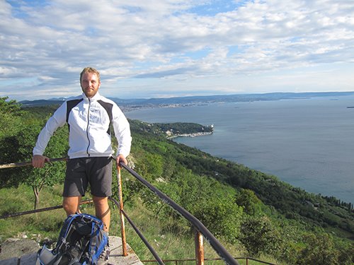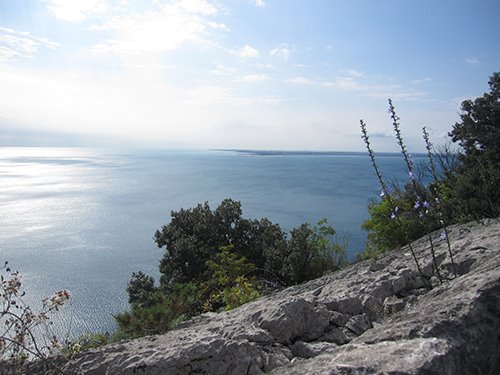 I boschi di querce, i cartelli bilingui, e i muretti a secco rendono questa zona molto diversa dalla vicina città. Cercando un’osmiza, il sentiero 3 mi fa costeggiare il monte Hermada, passando per Coisce, borgo abbandonato usato durante la guerra come presidio militare. Sceso a Ceroglie e Sistiana, inizio finalmente a camminare sul sentiero 1, a ridosso della costa.