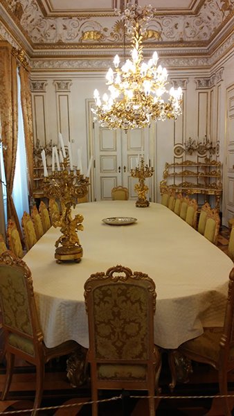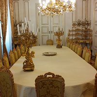 La maestosa scalinata, con tanto di fontana, conduce ai due piani superiori dove è possibile ammirare le stanze private del Barone e le sale di rappresentanza. Le stoffe, gli arredi e il marmo che ricopre tutte le pareti rendono il palazzo un autentico gioiello degno di un re. Osservando la sala da pranzo perfettamente conservata è immediato immaginarsi i succulenti banchetti che venivano serviti da una servitù in livrea tra posate d’argento e piatti decorati a mano.