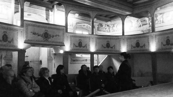Affrescato a tinte chiare, rappresenta scene mitologiche e bucoliche con una serie di putti. Curiosità d’angolo: tra la serie al maschile, un putto-bambina dai capelli biondi che riceve un omaggio floreale. Il teatro ha solo un piano elevato di palchetti, forse la capienza non arriva a cinquanta persone. Il nostro gruppo in visita ha avuto la fortuna di ascoltare un giovane musicista, un talento del luogo, che con la fisarmonica ha evocato vibranti emozioni, dando vita a immaginarie figure danzanti.