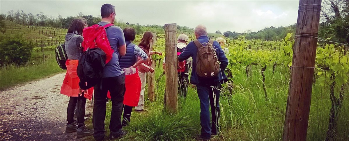 Decido poi di deviare dal percorso ufficiale e prendo una stradina che sale addentrandosi nel bosco che profuma di robinia. Il sentiero corre proprio in cima alle colline coltivate a vigneto dall’azienda che ci ospiterà per il pranzo/degustazione. Proprio qui, in mezzo alle vigne abbiamo appuntamento con la proprietaria, con la quale faremo quattro passi tra i filari. Nell’attesa approfitto per far vedere una stratificazione di Flysch (o ponca) molto evidente e dare un po’ di nozione geologiche- climatiche sul Collio. Finita la passeggiata guidata e l’interessante spiegazione sulla coltivazione naturale del vigneto, arriviamo alla sede dell’azienda, dove ci aspettano per il pranzo.