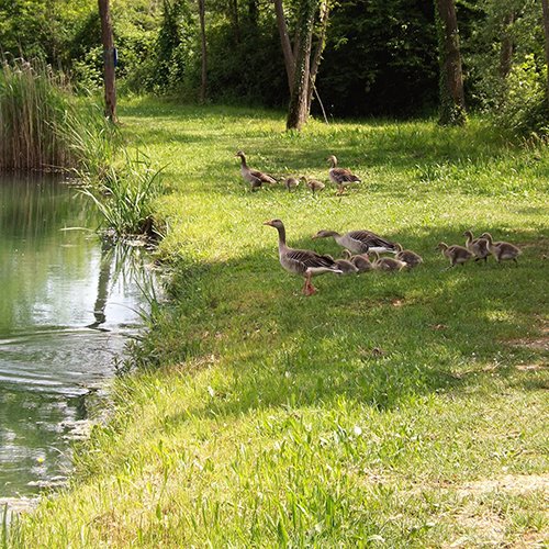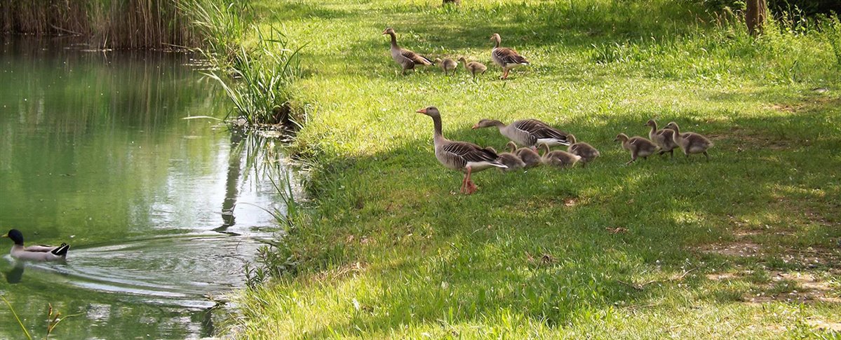 Alle ore 14 riprendiamo il cammino sull’Alpe Adria Trail attraversando molto silenziosamente e con macchina fotografica alla mano l’area naturalistica denominata Parco dei Laghetti Rossi, dove incontriamo quattro famigliole di oche grigie che, come ogni anno, nidificano in questo sito e sembrano abituate alla presenza umana, a differenza delle tartarughe d'acqua, circa una decina, che, rilassate al sole, si tuffano immediatamente in acqua non appena si accorgono di noi. Sullo specchio d’acqua, dei laghetti, una pittoresca distesa di ninfee non ancora sbocciate.