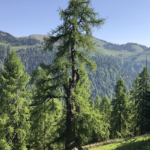 Scendiamo di un centinaio di metri a vedere le condizioni del larice più vecchio del Friuli. La neve di alcuni anni or sono gli aveva rotto alcuni rami e me lo ricordavo molto malridotto. Invece il possente tronco di oltre cinque metri di circonferenza aveva trovato la forza di rinascere ancora. Nuovi germogli adornano i vecchi rami e ancora la sua cima si erge lucida tra i larici più giovani che gli fanno corona. Solo esseri abituati a lottare contro i dolori e le sofferenze della vita possono vivere tra queste montagne. Siano uomini, animali o piante.