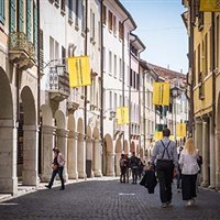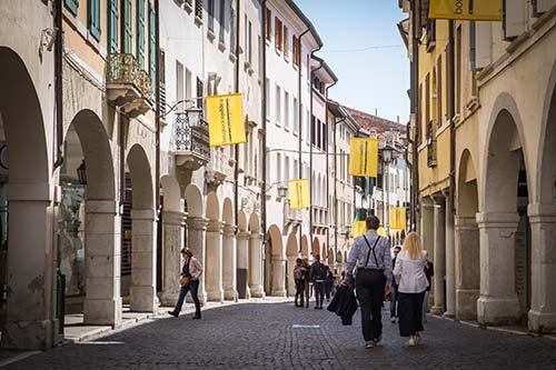 E c’è da sorridere nel vedere chi cattura immagini da riflessi sul bagnato, di sera, quando il mattone e i decori hanno un colore più caldo, mentre ancora si parla di libri nei locali tipici del centro. Alle nove di mattina già ordinati scolari della Primaria sono in fila per accedere a Palazzo Ricchieri (Trecento, gotico veneziano), sede del Museo Civico d’Arte. Di fronte, la Galleria d’Arte intitolata ad Harry Bertoia, con la famosa sedia Diamond, una scultura da lui descritta fatta d’aria e di acciaio, inserita nel complesso di Palazzo Spelladi, pure del Trecento, dal nome di una delle dodici casate più antiche della città, nobilitata nel XV secolo. Acquisito dal Comune nel 1980, dal 2014 ha funzione espositiva. Moderna struttura interna, ospita fino al 15 ottobre La Città dipinta, i Palazzi sul Canal al primo piano, al secondo capolavori di giovani talenti in Icons of Art, i mosaici della Scuola di Spilimbergo a rappresentare personaggi icona del nostro tempo. Da non perdere.