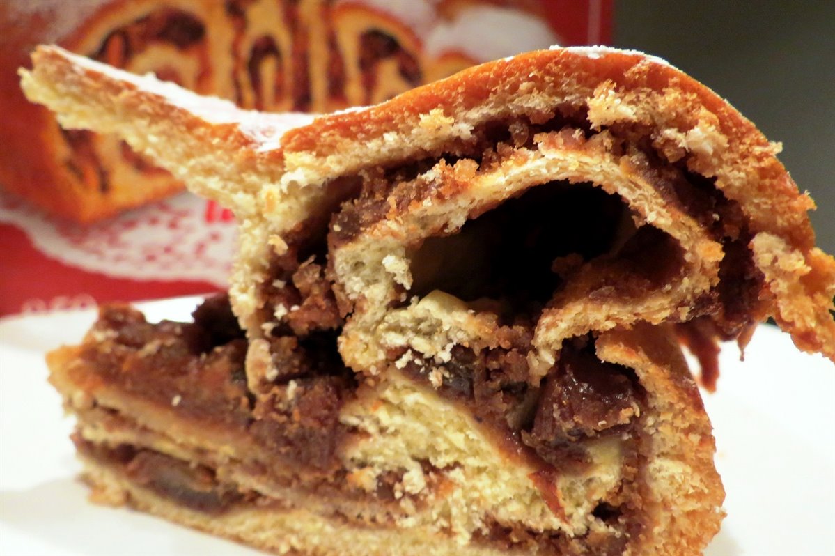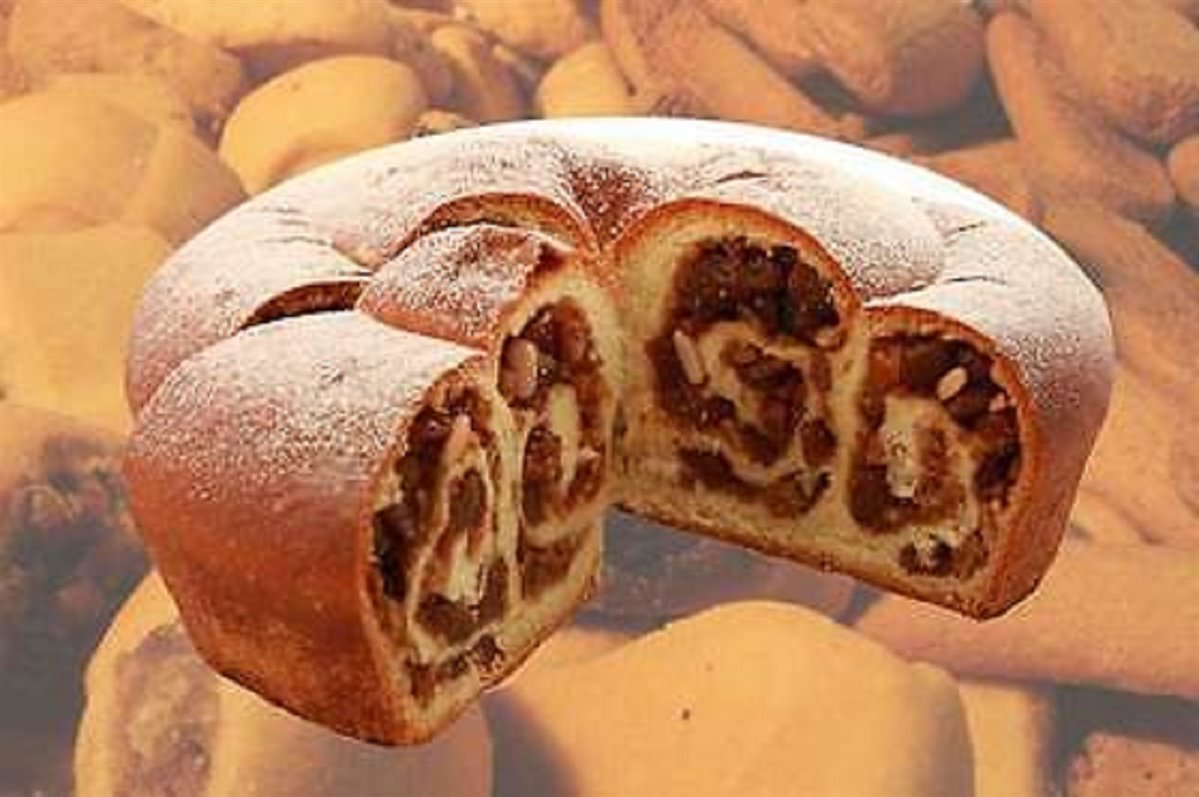 Il ripieno di questo dolce è fatto di frutta secca, noci, nocciole, pinoli, mandorle, uvetta, amaretti, biscotti secchi, in alcuni casi limone, e un bel goccino di grappa per rendere tutto il composto così rigoglioso ed estasiante per il palato e poi in pari quantità di peso con il composto vi è la pasta dolce che viene ben lievitata, riempita di composto, correttamente arrotolata a chiocciola e rilievitata in modo da sostenere l’abbondanza della farcitura.