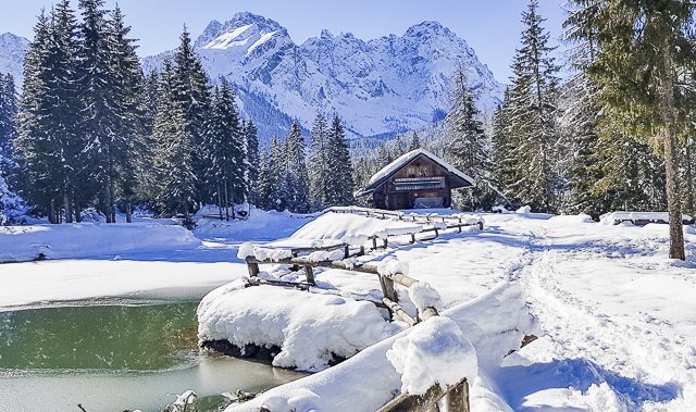 Ich bin heute in Sappada, wo aus dem Piave ein echter Fluss wird. Die Wege entlang dieses glorreichen und fast heiligen italienischen Flusses eignen sich perfekt für sichere Spaziergänge ohne jegliche Lawinengefahr und in Ortsnähe. Innerhalb kürzester Zeit kann man nach einer kurzen, problemlosen Wanderung in 1186 m Höhe den stimmungsvollen Anglersee Ziegelhütte erreichen, der halb zugefroren in einer spektakulären Kulisse vor den verschneiten Alpen liegt.