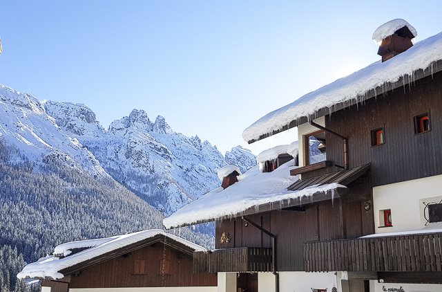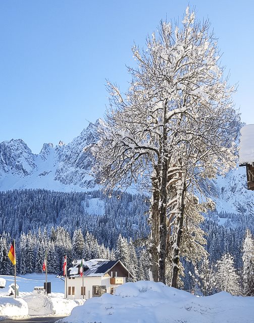 Auch die mit Schnee bedeckten, charakteristischen Gebirgshäuser laden zu einer gemütlichen Schlemmerpause ein, wo man in vielen Lokalen typische Spezialitäten aus Sappada finden kann: ich habe eine köstliche Wurst- und Käseplatte genossen sowie einige hervorragende Grappas.