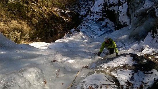 Una volta giunti alla base della cascata, Marco mi assicura mentre risalgo il primo tiro. Il ghiaccio è sottile, si vede il fluido scorrere nelle vene di questa colata, e la cosa mi incanta. Il tiro non oppone difficoltà particolari, ma diverte. Assicuro Marco che sale veloce togliendo le protezioni.