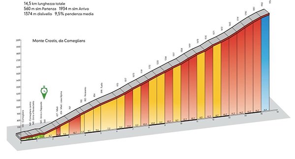 Ein überanstrengtes Herz unter dem Schatten einer Konifere und dann plötzlich unter freiem Himmel mit Blick auf drei Nadelkurven, der Ihr Herz trotz der bis dahin Ihrem Körper unbekannten Werte vierteilen wird, auch wenn Sie einzig der Emotion, die Sie in diesem Augenblick fühlen werden, die Schuld dafür geben werden, dass Sie völlig weggetreten sind. Die 2000 m in Begleitung von pfeifenden Murmeltieren zu erreichen und auf dem Gipfel des Crostis anzuhalten, wird die Verwirklichung der im Radsport zu erreichenden höchsten Gefühle sein.