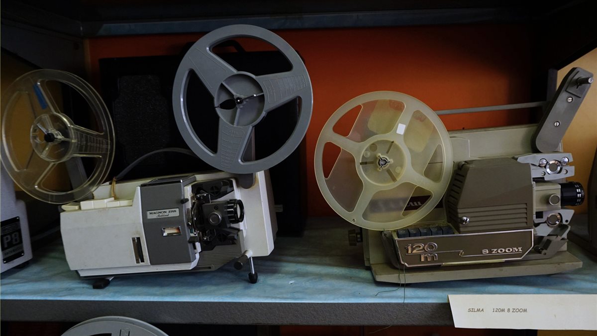Odi erählt von der Zeit, in der er als Filmvorführer begann und die berühmten „Filmrollen“ in die wie im Museum ausgestellten Filmvorführgeräte einlegte. Zwischen den Regalen fühlt man sich von den Objektiven der vielen Fotoapparate von allen möglichen Marken und Modellen beobachtet. Ebenso zu sehen sind noch funktionierende Projektoren und Tonbandgeräte.