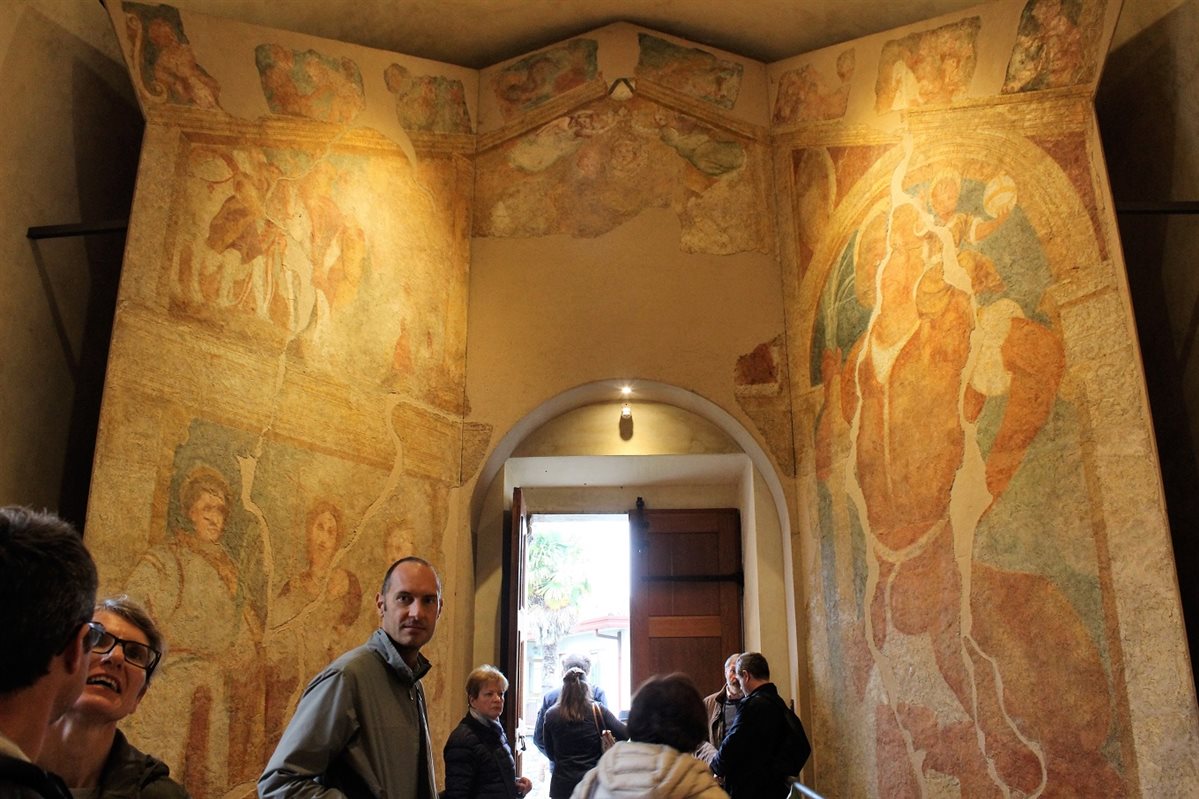 Ich habe im Voraus daran teilgenommen und bezeuge, dass ich sowohl die kostbaren Werke als auch die Organisation geschätzt habe. Die Fresken von Giovanni Antonio de’ Sacchis (1483-1539), genannt il Pordenone, verstehen es noch zu erzählen. Ich muss sagen, der Nachmittag ist wie im Flug vergangen. Ein Dankeschön an Ramona, unserer Führerin, und an Elena. Wussten Sie, dass er es mit seinen vielen Werken, mehrmals verheiratet und auch wenn er von Tizian verdrängt wurde, so dass er einen wichtigen Auftrag verlor, am Ende geschafft hat, einen übertragbaren Adelstitel und einen Sitz in jenem Venedig zu erhalten, in dem er geschmäht worden war? Ein schaffensfreudiger Künstler und Autodidakt im Stile Vasaris. Im Friaul ist er heute der einflussreichste Maler der Kunststudien. Sein Schüler war Pomponio Amalteo, der dann sein Schwiegersohn wurde. Giovanni Antonio de’ Sacchis wurde in Pordenone geboren, folgte der Schule Tolmezzis, nahm die Farbnuancen des Giorgione in sich auf und gelangte damit zur Reife: vom Zeichnen und den starken Farbtönen wechselt er auf zarte Striche, in der Großartigkeit von Figuren und Szenen entwickelt er sich von Formen der optischen Täuschung weiter zu dynamischeren, eleganteren und freieren Formen. An jenem Samstagnachmittag sah ich eine ruhige, aufmerksame Gruppe mit der Nase nach oben. Die Fresken des größten friaulanischen Vertreters der Renaissance sind von einer unglaublichen feierlichen Schönheit und lassen in ihren Details eine umfassende Kenntnis und große Verbundenheit mit dem Gebiet erkennen. Gewicht hat auch die landschaftliche Umgebung, die vom Bus aus zu sehen ist, wie die kleinen Ortschaften. Tief stehende weiße Wolken am Fuße der Berge umrahmten ab und zu das herbstliche Blattwerk. Eine große Künstlerin, die Natur. Während der kleinen Rast zur Erholung Szenen des heutigen Lebens im Café mit dem traditionellen Tresen und dem Fernseher im Nebenzimmer. Ein tajùt (Glas Wein), ein paar Worte in netter Gesellschaft.