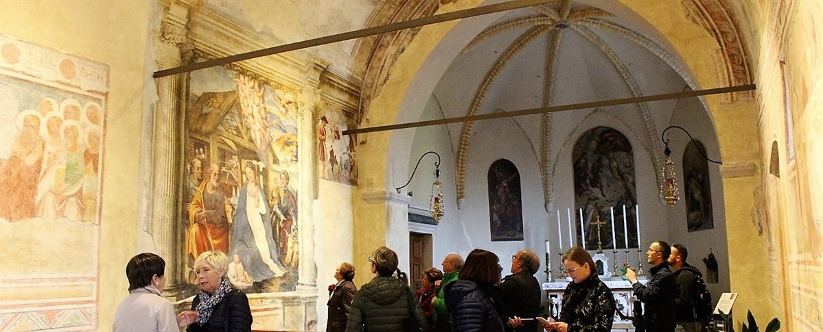 Zwischen den Bildern der Kunst einige Erinnerungen: die warmen und strahlenden Farben, die Kuppel des Chors der kleinen Kirche mit Friedhof in Gaio, von weit vor 1490. In Valeriano das erste mit Sicherheit von dem Künstler stammende Werk, das Triptychon mit seiner Unterschrift, in dem kleinen von der Bruderschaft der Flagellanten um 1300 errichteten Gotteshaus. Das Leuchten des pausbackigen kleinen Kindes auf den Kissen in der Geburt Christi mit großer Farbwirkung, die geflügelten Putten, die an die Putten der Arkaden des Gewölbes von Travesio erinnern, Gegenstand einer fotografischen Studie einer bekannten Persönlichkeit aus Casarsa. Die Sanftheit der Züge des Erzengels, der doch kraftvoll einen wütenden Dämon durchbohrt. Einzelheiten, lebhafte Ausdrücke, Lichtstudien, Szenen, die sich in ihrer Gesamtheit betrachtet als großartig und salbungsvoll erweisen, machen diese Orte zu einer Gelegenheit ausgedehnter Erhebung.  Es werden fünf Kirchen besichtigt. San Marco in Gaio, San Martino in Pinzano, Santo Stefano und S. Maria-Oratorio dei Battuti in Valeriano, San Pietro in Travesio, ein triumphierender Abschluss.  Gleich ob Sie die Besichtigung am Samstag oder die zusätzlichen Kirchen am Sonntag wählen, als Abschlussgeschenk erhalten Sie einen kleinen  bebilderten Führer für die 15 Ziele.
