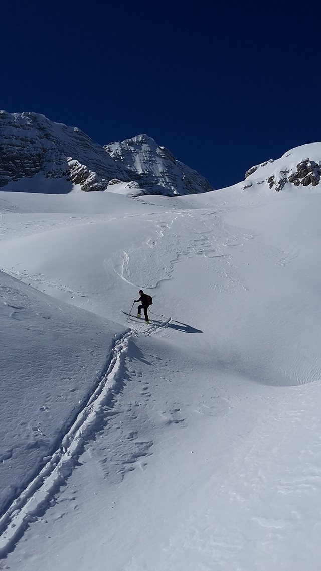 La sua particolarità è data dall’eccezionale quantità di neve che si accumula durante la stagione fredda pur essendo a quote relativamente basse: diciamo che le precipitazioni nevose sul monte Canin a 2200m possono raggiungere anche i 15 metri, il record delle Alpi. Ed è proprio sul Canin e sul Montasio (l’altra montagna simbolo di Sella Nevea) che si snodano i percorsi più affascinanti per gli amanti delle pelli, tanti quelli che si possono scegliere con più gradi di difficoltà: nelle foto vedete l'itinerario verso Sella Ursic ma forse il più famoso è quello che vi porta al monte Forato (Okno in sloveno) dove transita anche la famosa gara di scialpinismo del Canin che si svolge solitamente a metà aprile.