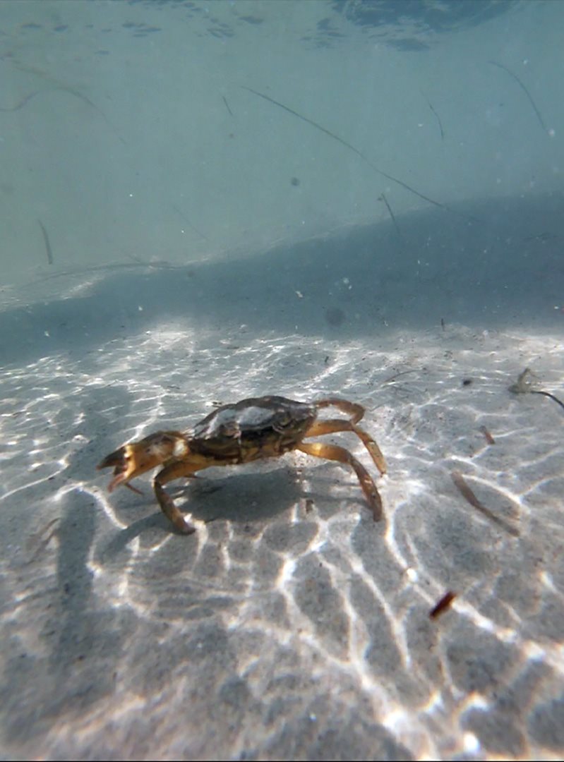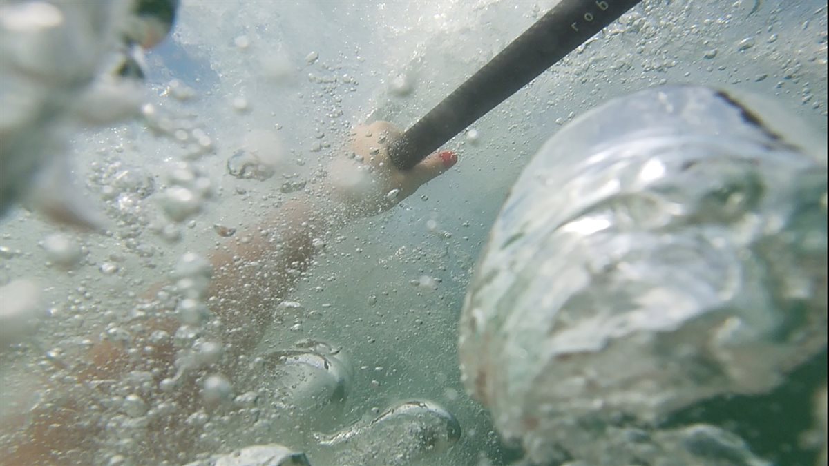 Auf dem Board folge ich Giovanni bis ins tiefe Wasser, indem ich auf dem Board kniend paddle, um mich mit dem Paddel und dem Brett vertraut zu machen. Sobald ich das “Floß” erreiche, ist es endlich Zeit, aufzustehen! Hände aufgelegt, Beine in Position gebracht, Beinarbeit, um aufzustehen und los geht's… Das ruhige Wasser und die Windstille helfen, deshalb stehe ich relativ mühelos auf den Beinen, aber das Gleichgewicht halten ist eine andere Frage! Ich lerne, langsam zu drehen, und dann schneller zu drehen und…splash! Es war wirklich Zeit für einen erfrischenden Sprung ins Nasse!
