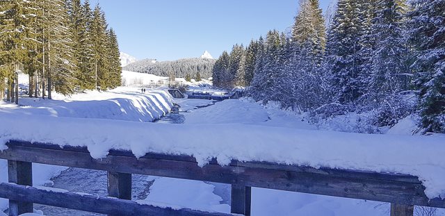 Today, I am in Sappada, where the Piave begins to widen. Along the paths that surround this revered, glorious Italian river, there are beautiful itineraries completely safe to explore on foot, away from the danger of avalanches, and close to the village centre. In a very short time, after a short walk without any hurdles, you can reach an altitude of 1186 m above sea level at the picturesque Ziegelhutte sport fishing lake, half-frozen and surrounded by the spectacular scenery of the snow-capped Alps.