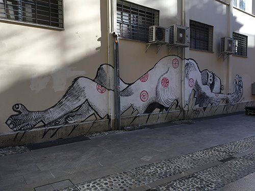 Colours invade the visual field. A special energy emerges from the painting that marks the rebirth of the narrow street and “carved out” a new desire on the wall to perceive the city with fresh eyes. A mural that has transformed this central street into a unique space. An open-air show.