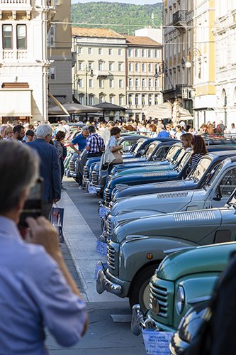 Da Caporetto (Kobarid, Slovenia) al castello di Miramare, le quaranta Topolino giungono a Trieste nella celebre piazza Unità d’Italia. Qui, sotto la volta di un cielo azzurro, a primavera inoltrata, palazzi illustri fanno da cornice agli svariati colori delle auto leggendarie. Sostano, di fronte agli occhi appassionati dei loro proprietari, dalle 12 alle 18, rendendo più curiosa e pittoresca la piazza principale del capoluogo della nostra suggestiva regione. Dive d’altri tempi, attirano gli sguardi curiosi dei passanti che si soffermano ad ammirarne le forme.