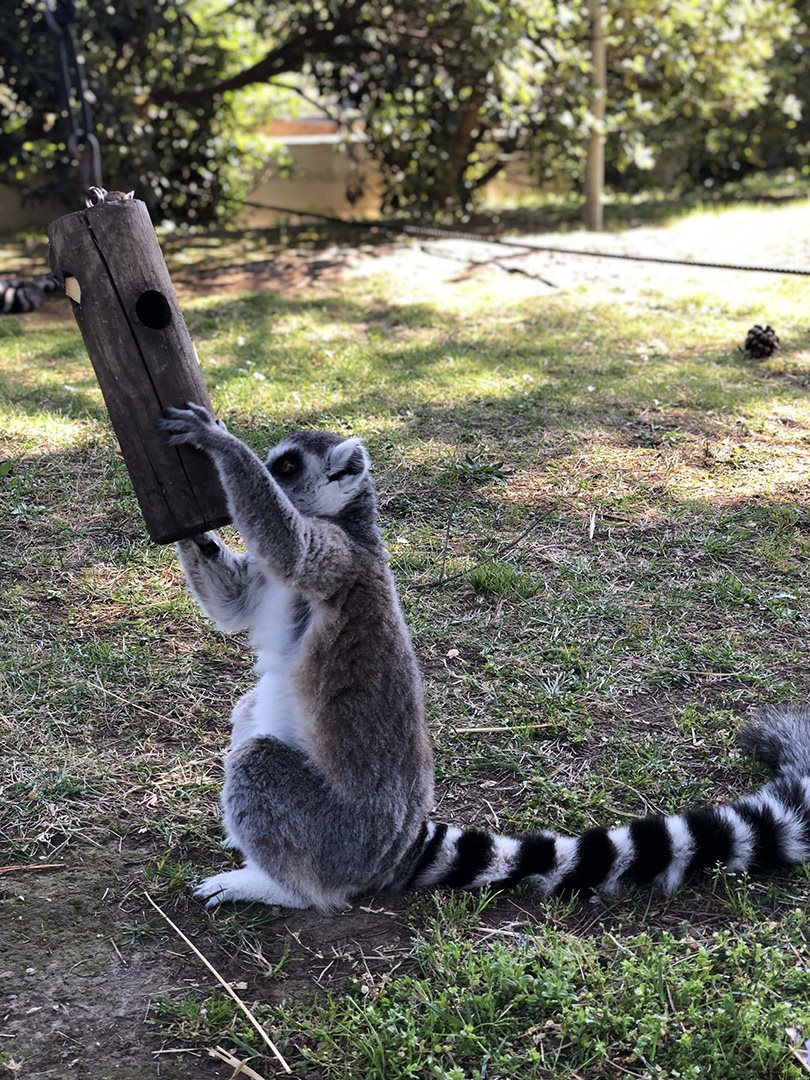 After positioning the food enrichments, we sit on some tree trunks resting on the ground. The lemurs immediately start to eat: they climb, do somersaults and eat while looking at us with their yellow eyes... they seem to appreciate our gift.