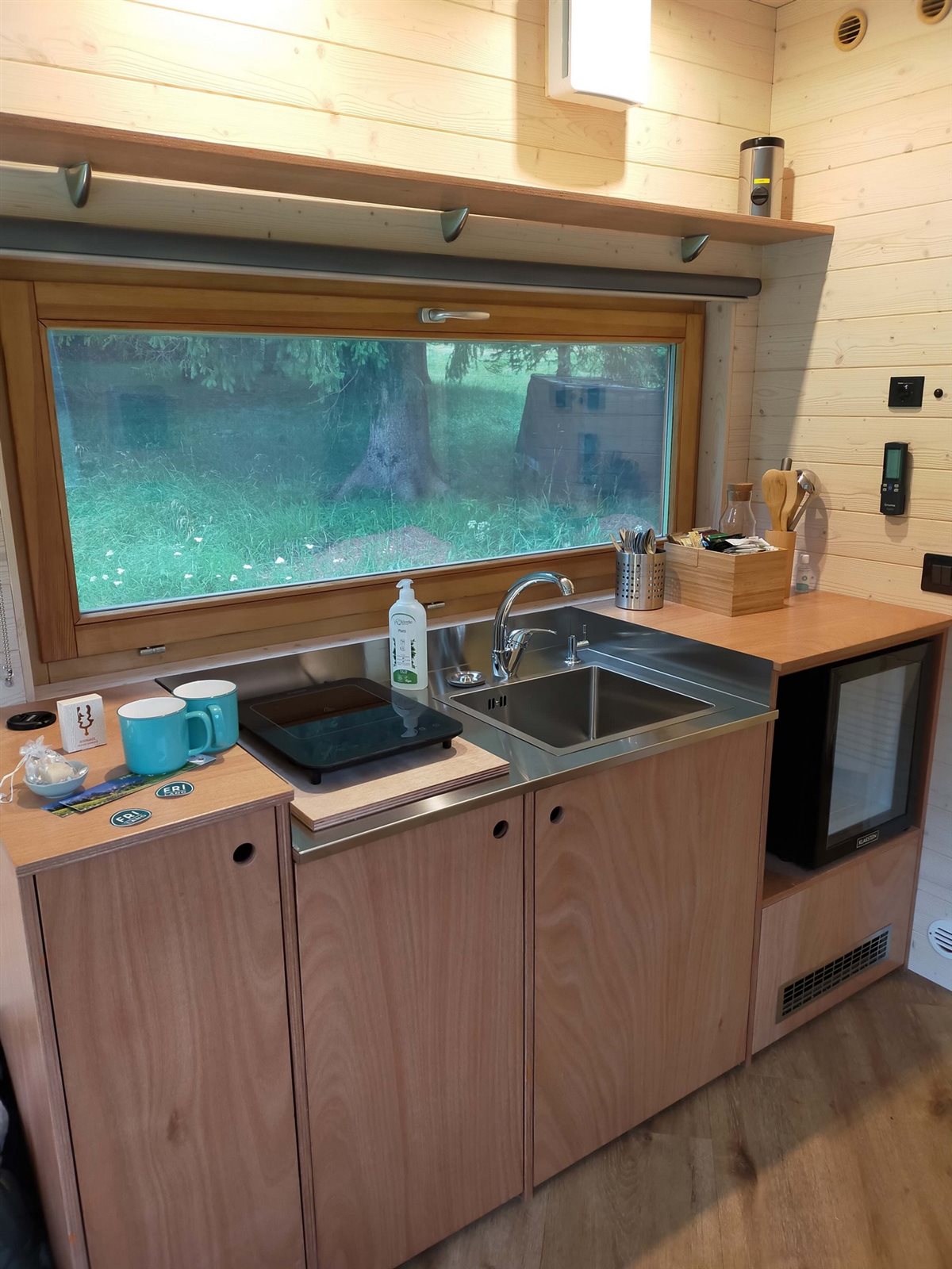 We enter quickly, as we are curious to see this room surrounded by nature. We are pleasantly surprised by the light wood, which makes it seem more spacious. It doesn't seem so small and has everything we need. The bathroom has a standard WC (not a chemical one) a washbasin and a nice shower. The kitchen has a large window and is fully equipped, in about one and a half metres there is everything necessary for those who want to cook. Opposite there is another window above a folding table with two seats, useful for eating or for a computer.