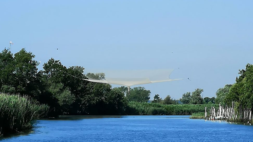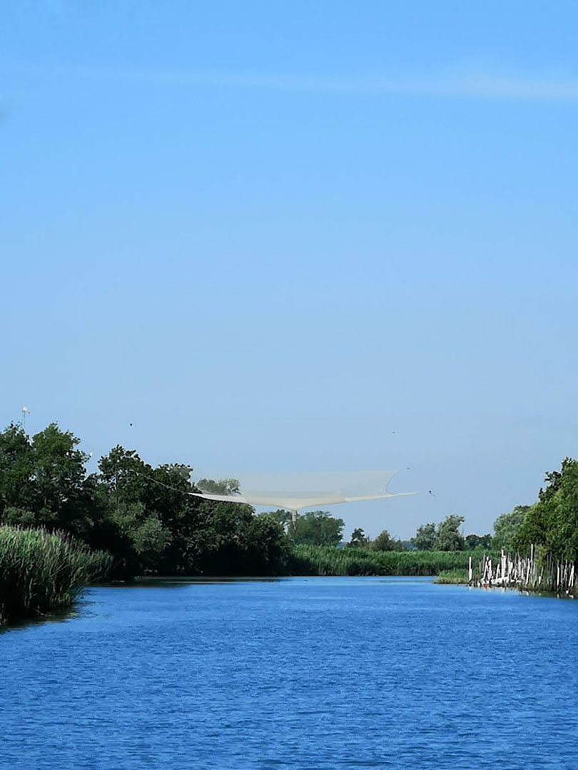 Dopo una piacevole sosta inizia il viaggio di rientro. Nel frattempo la marea è salita e avvicinandoci la rete di Bepi pare ancora più grande, così sospesa tra sogno e realtà.