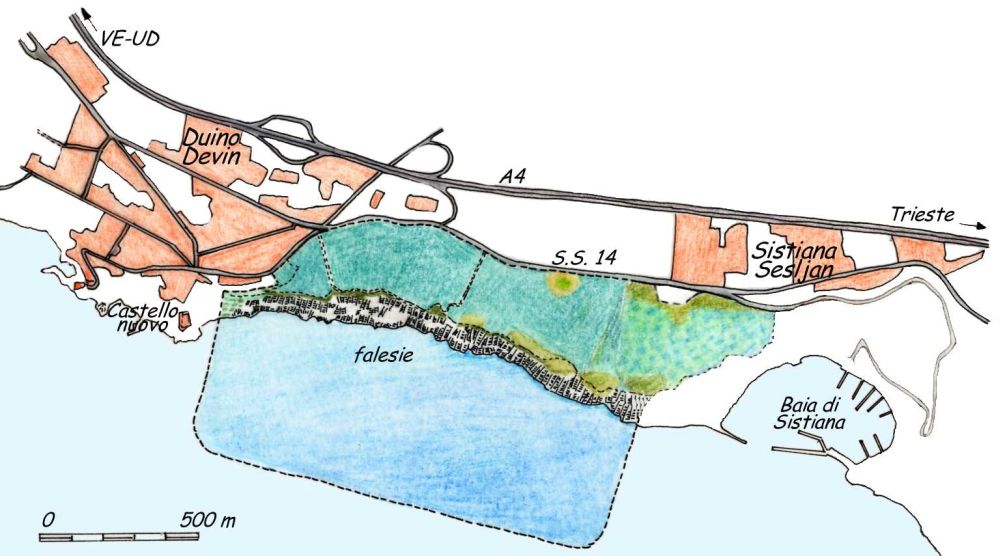 The Duino Cliffs, like the entire karst plateau, are composed of carbonate rocks formed from the sedimentation of animal shells on the floor of a shallow sea.