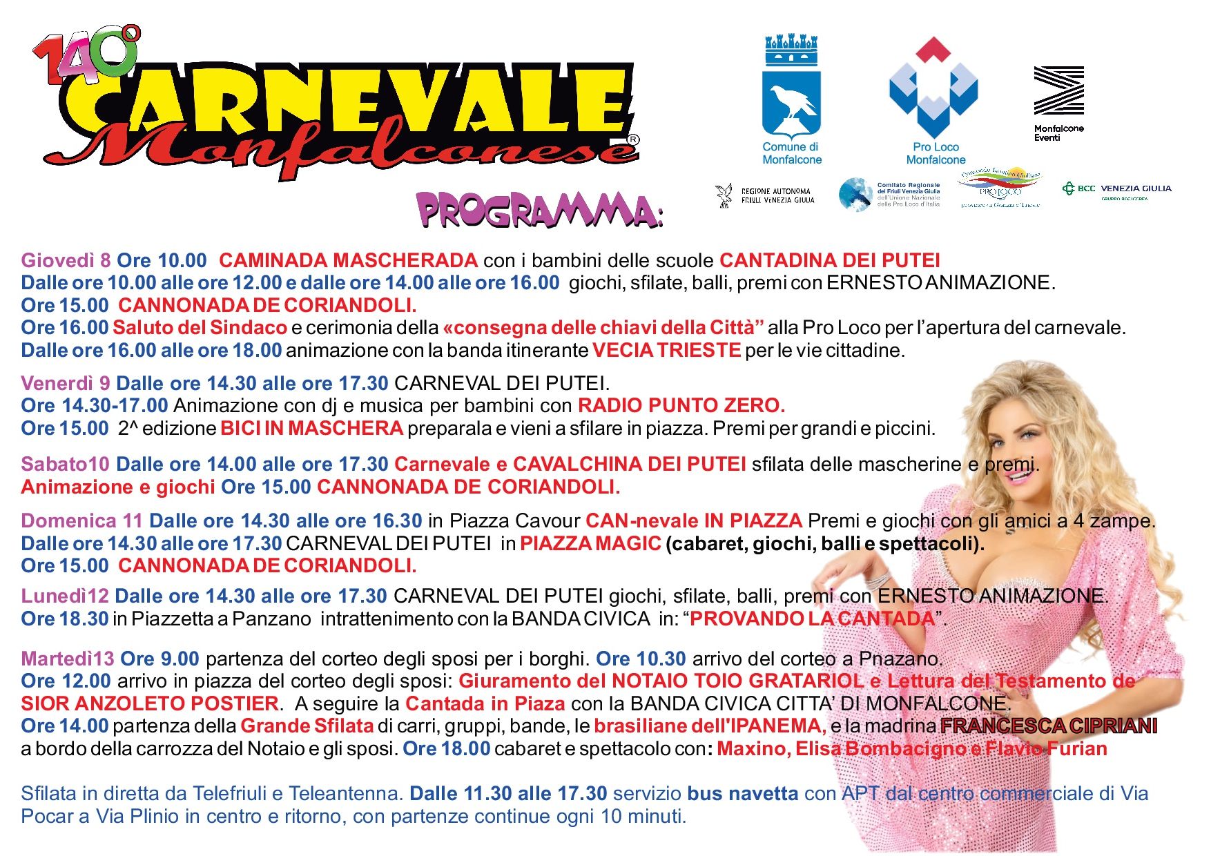 Organizzata dalla Pro Loco di Monfalcone con il sostegno della Regione Autonoma Friuli Venezia Giulia, del Comune di Monfalcone, dell'UNPLI, del Consorzio Isontino Giuliano delle Pro Loco, del Servizio Civile Universale e della BCC Venezia Giulia, la manifestazione porterà in città maschere, musica, giochi di gruppo, attività per bambini, spettacoli dal vivo, stand enogastronomici, carri allegorici e tanto altro!