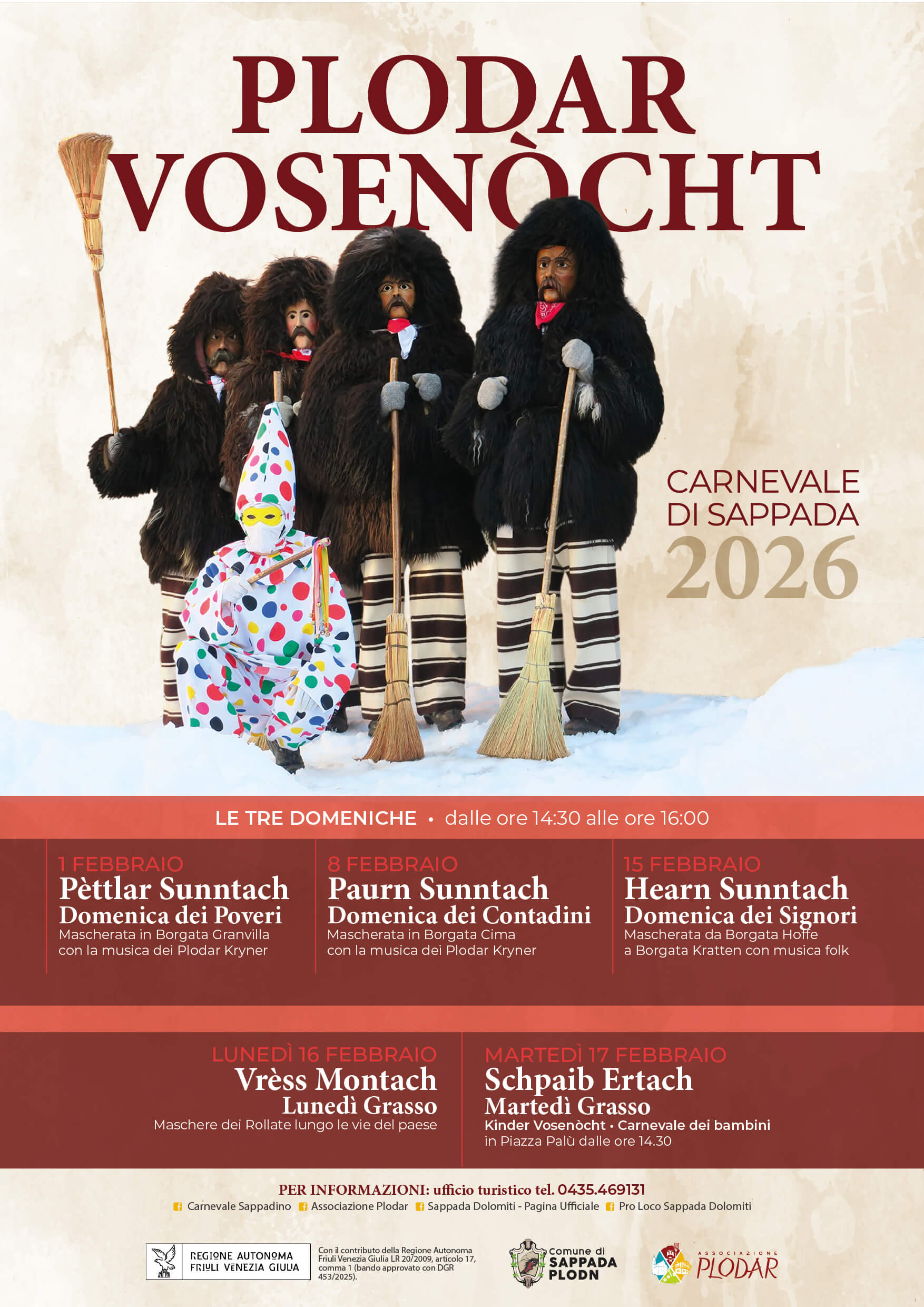 Una delle tradizioni più caratteristiche di Sappada / Plodn, isola linguistica di matrice tedesca, è il Carnevale (vosenòcht), momento fondamentale in cui rivivono le tradizioni locali e la cultura popolare, in cui si intrecciano ritualità e folclore, occasione di gioco, divertimento e trasgressione. Protagonisti assoluti sono le maschere (letter): per camuffarsi completamente e non farsi riconoscere dai compaesani vengono usate maschere in legno (lòrvn) intagliate da artigiani locali e tramandate spesso di generazione in generazione. I festeggiamenti del Carnevale sappadino si svolgono come un tempo nelle tre domeniche che precedono la Quaresima, dedicate ai tre diversi ceti della società: la “Domenica dei signori” (hearn sunntach) è l'espressione della classe benestante e occasione di sfoggio dei costumi più raffinati. Le maschere indossano vestiti appropriati a seconda della domenica e inscenano situazioni divertenti in cui coinvolgono gli spettatori e le persone delle case a cui fanno visita.