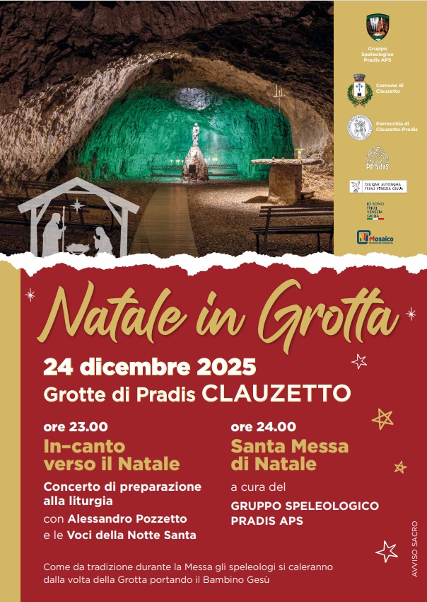 Durante la messa gli speleologi del Gruppo Speleologico Pradis APS si caleranno dalla volta della Grotta accompagnando il Bambinello nel presepe.