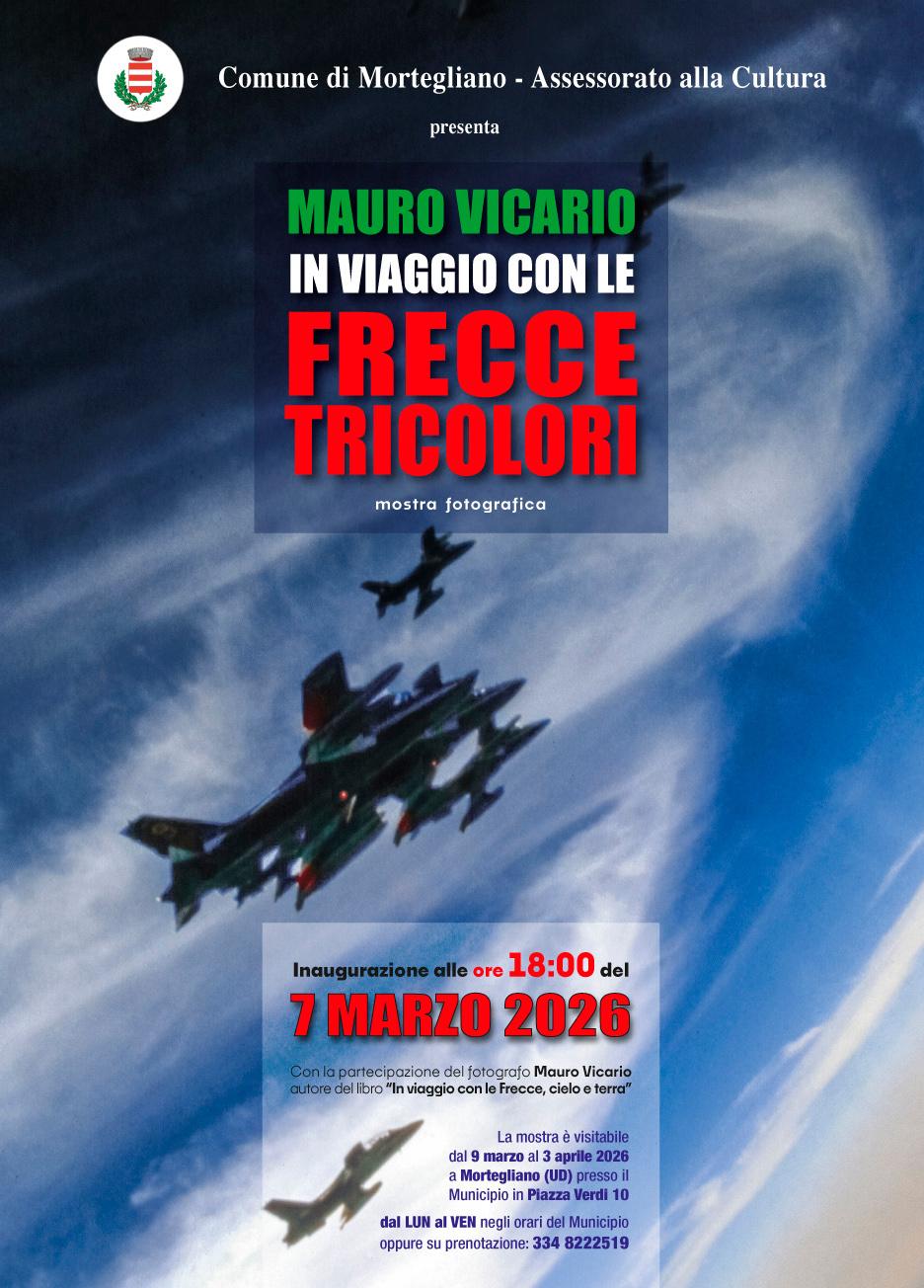 Dal 09 marzo 2026 al 03 aprile 2026 sarà allestita presso l'atrio del Comune di Mortegliano la mostra fotografica “MAURO VICARIO - IN VIAGGIO CON LE FRECCE TRICOLORI” con i seguenti orari: