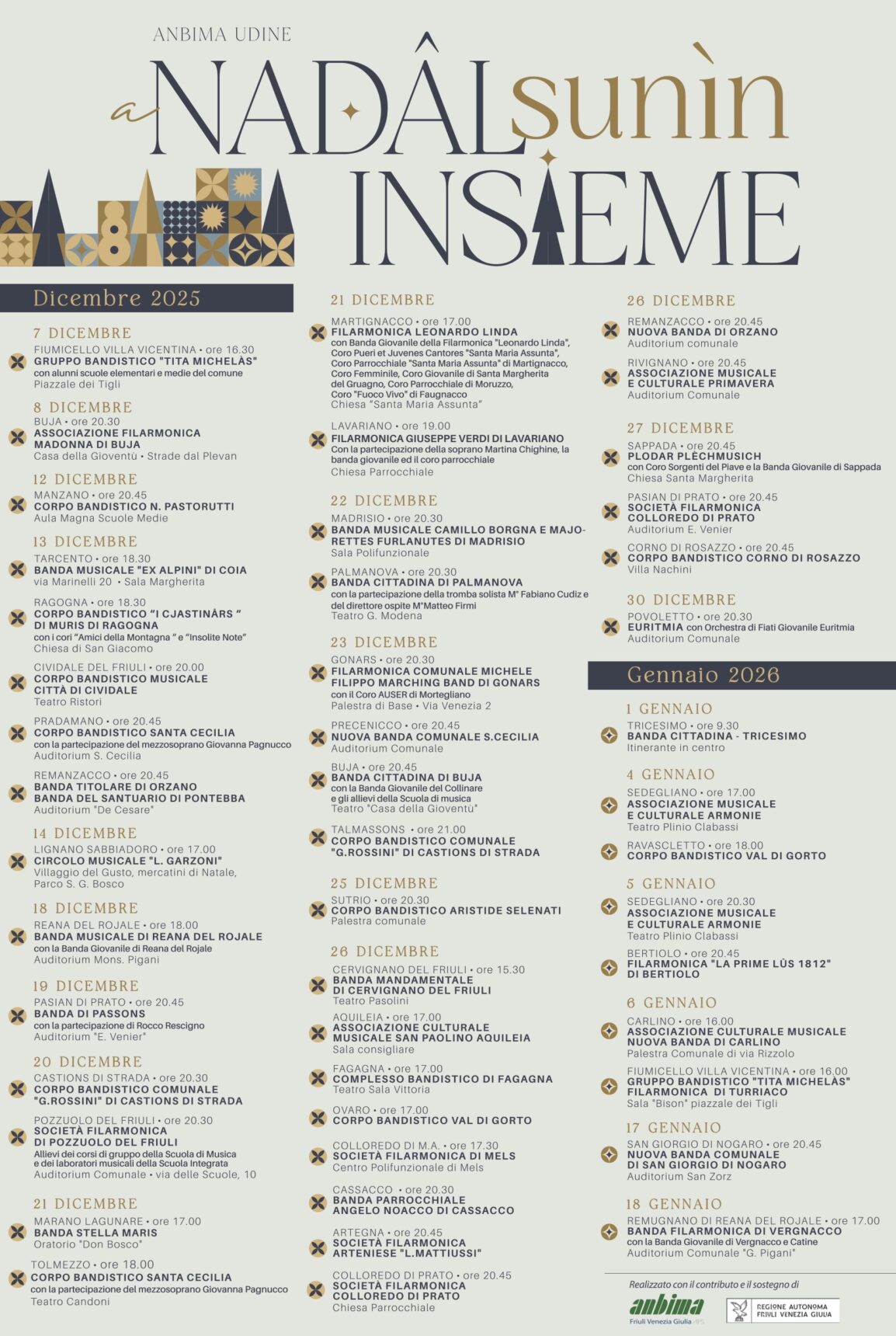 Si rinnova il ricco cartellone di concerti nel periodo delle festività natalizie, organizzati dalle bande associate ad ANBIMA nella provincia di Udine.