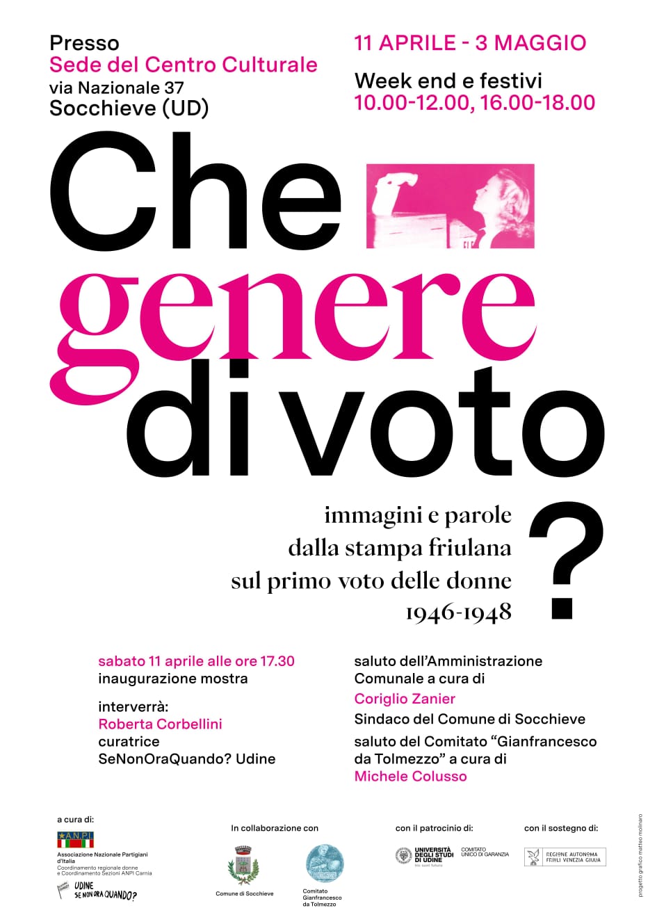 Un primo piano sulla situazione della Carnia, in particolare sulla popolazione, sull’economia e sulle figure di donne impegnate a livello civico e politico, nel secondo dopoguerra e negli anni della ricostruzione. È questo l'obiettivo della mostra “Che Genere di Voto? " Immagini e parole dalla stampa friulana sul primo voto delle donne 1946-1948". In occasione dell'ottantesimo anniversario del suffragio universale e della prima partecipazione alle elezioni delle donne italiane nel 1946 l'esposizione sara' riproposta a Socchieve presso la Sede del Centro Culturale e del Comitato "Gianfrancesco da Tolmezzo" in via Nazionale n.37 ed inaugurata sabato 11 aprile dalle 17.30.