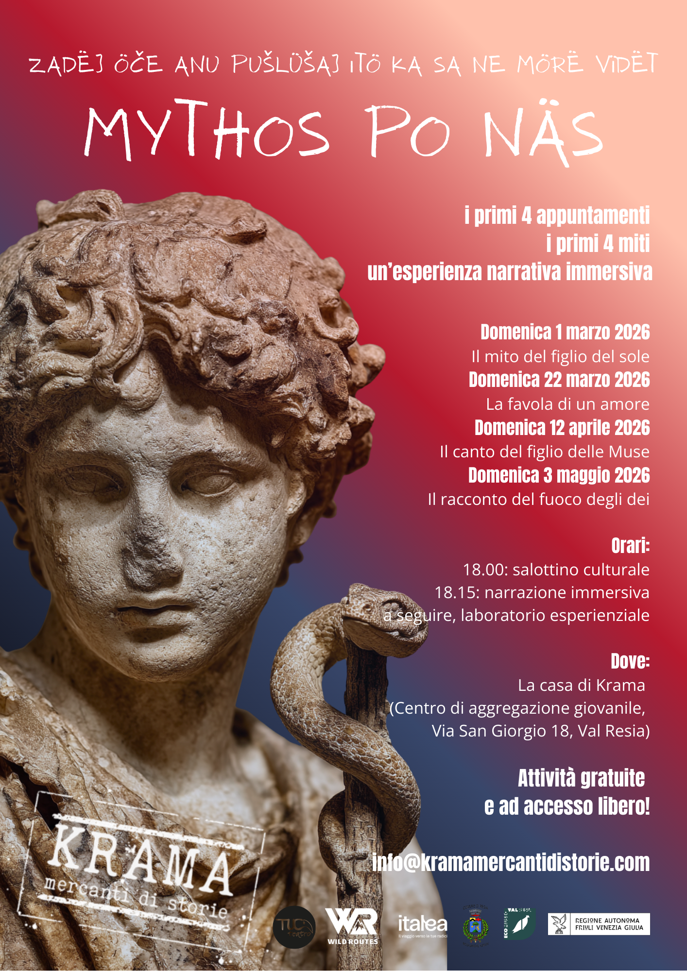 L’associazione APS KRAMA, Mercanti di Storie ETS, in collaborazione con TUC Teatro APS, Wild Routes APS e Ricorda Ritorna Radica FVG APS, con il patrocinio del Comune di Resia e dell’Ecomuseo Val Resia e con il sostegno della Regione Autonoma Friuli Venezia Giulia, presenterà a breve MYTHOS PO NÄS, un progetto culturale che porterà grandi miti classici nell’idioma locale, il resiano, attraverso una nuova formula di narrazione immersiva e partecipata.