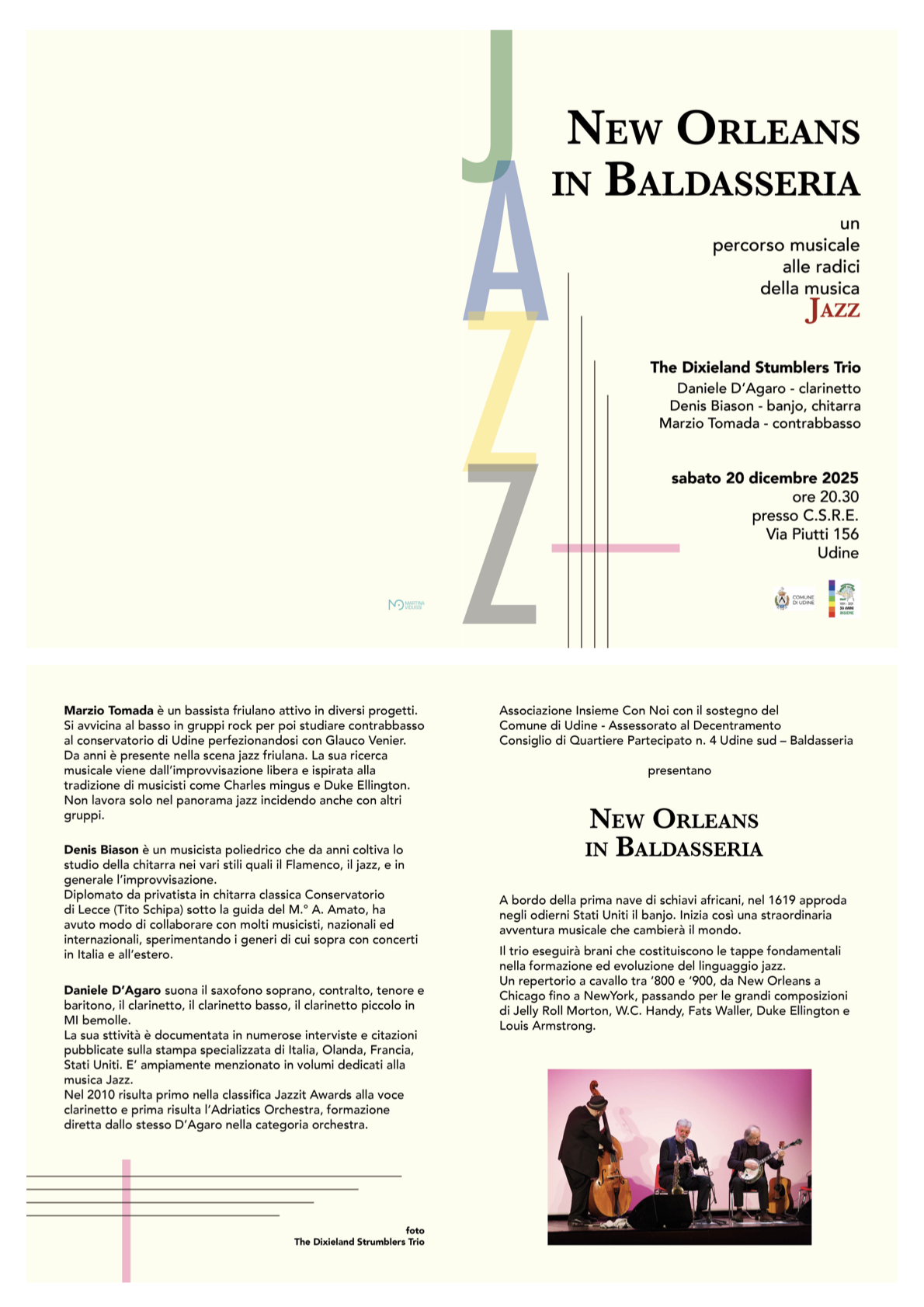 Protagonista della serata sarà The Dixieland Stumblers Trio, composto da Daniele D’Agaro al clarinetto e ai sassofoni, Denis Biason al banjo e alla chitarra, e Marzio Tomada al contrabbasso. Tre musicisti con esperienze e carriere di rilievo, attivi da anni sulla scena italiana e internazionale.