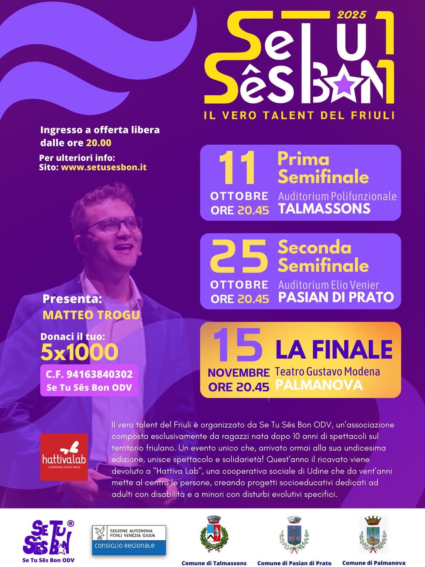 Se tu sês bon è l’originale talent show nato in Friuli Venezia Giulia e completamente giovanile. L’intera organizzazione nasce nel 2015 dall’idea di un gruppo di ragazzi e ancora oggi continua la tradizione dell’organizzazione esclusivamente giovanile.