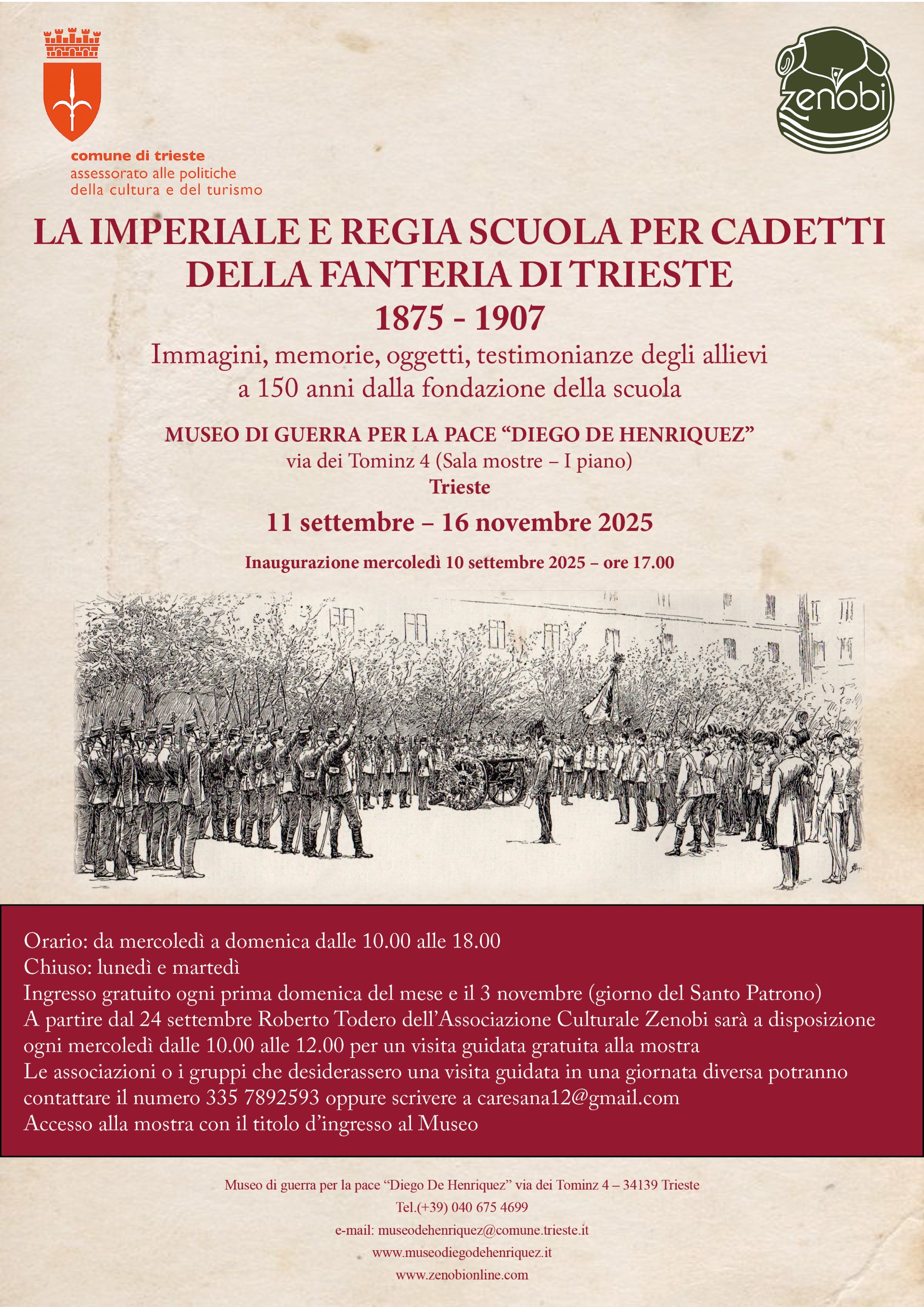On Wednesday, September 10, 2025, at 5:00 PM, the Diego de Henriquez Civic War and Peace Museum on Via dei Tominz, 7 4 in Trieste will open the exhibition "The Imperial and Royal Infantry Cadet School of Trieste. 1875-1907," created in collaboration with the F. Zenobi Cultural Association and curated by Roberto Todero.