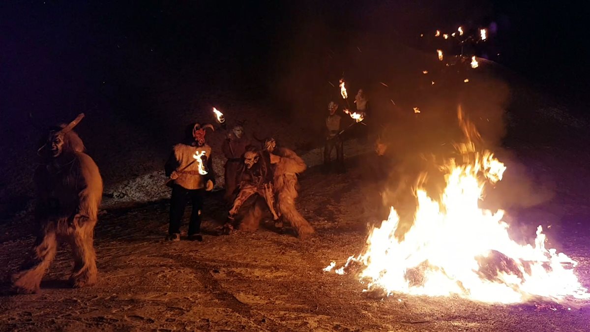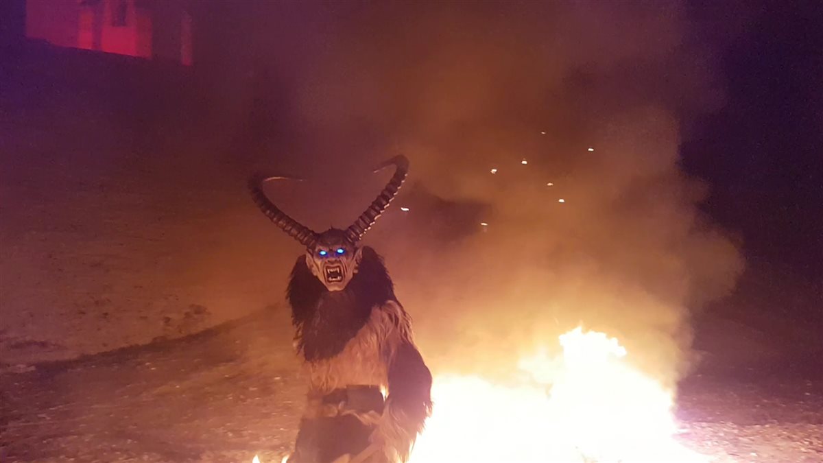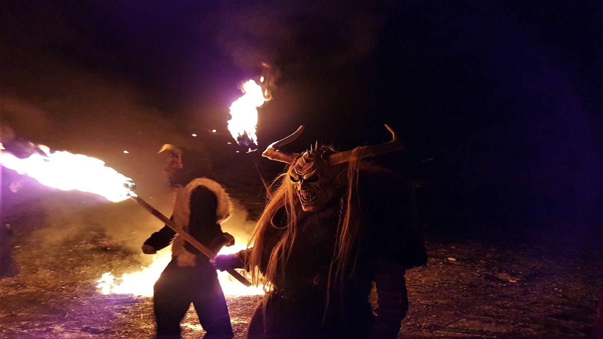 Quando le tenebre della notte fanno la loro comparsa e il buio più totale avvolge l'abitato, ricoperti da disordinati mantelli di pelliccia, illuminati da fiaccole e falò, tra il frastuono di catene, campanacci, corni, colpi di fruste, dai boschi escono i terribili Krampus