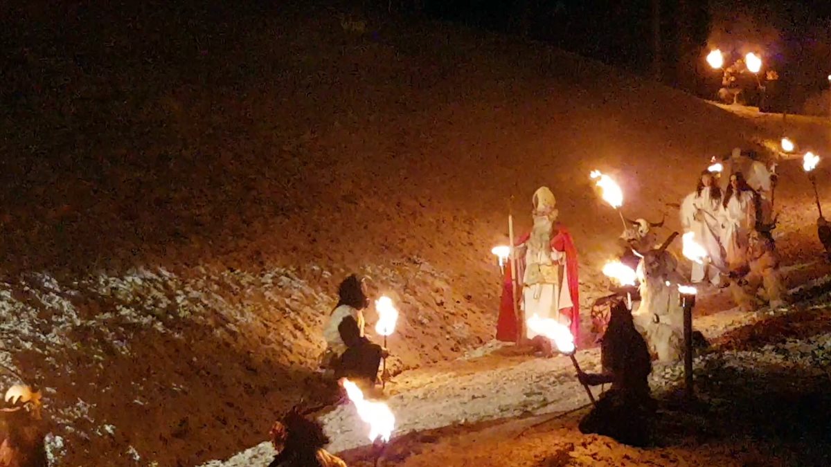 Una volta riportata la pace e la serenità bene e male sfilano per le vie del paese, fino al grande falò dove il Santo è pronto a compensare tutti i bambini di ogni età, buoni e pentiti con dolciumi, Krampus di pane, the e vin brulé.