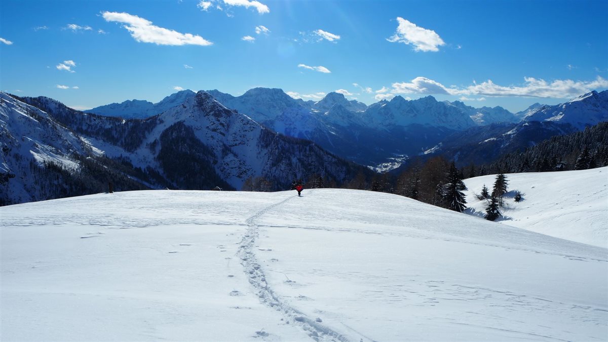 Viste le straordinarie giornate di sole, non posso che lanciarmi ancora una volta alla scoperta del Friuli. Per una ciaspolata l'occasione è ottima. Decido di scegliere un itinerario che sia sicuro ma anche poco affollato, silenzioso e soprattutto incantevole. Quale miglior posto se non Casera Bordaglia di Sopra? Armato di sci da scialpinismo io e di ciaspole la mia amica di avventura Giulia raggiungiamo lo stabilimento Goccia di Carnia a Forni Avoltri dove viene imbottigliata un'acqua dal sapore genuino. Qui, seguendo le numerose indicazioni, iniziamo a percorrere la dolce mulattiera in leggera salita che, inoltrandosi in uno splendido bosco di abeti, si conduce in Casera Bordaglia di Sotto. Le nostre tracce sono le uniche, ho fin timore a violare i candidi mantelli di neve che ricoprono gli ampi prati. Lo scenario è incantevole. Dopo una breve sosta, decidiamo però di proseguire oltrepassando una piccola chiesetta quasi totalmente sommersa dalla neve, verso la Casera Bordaglia di Sopra. Ci inoltriamo nuovamente nel bosco seguendo il sentiero CAI  142 che ci conduce su ampio prato da dove la vista sul Monte Volaia è incantevole. Raggiungiamo la caratteristica casera in legno e pietra, dalla quale scorgiamo poco più in giù il celebra Lago di Bordaglia ghiacciato e ricoperto dalla neve. La vista da qui è certamente ripagante e ancora una volta mi accorgo di vivere in una regione straordinaria.