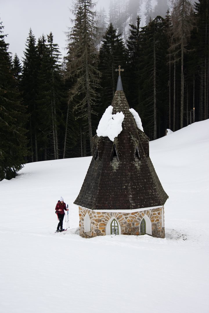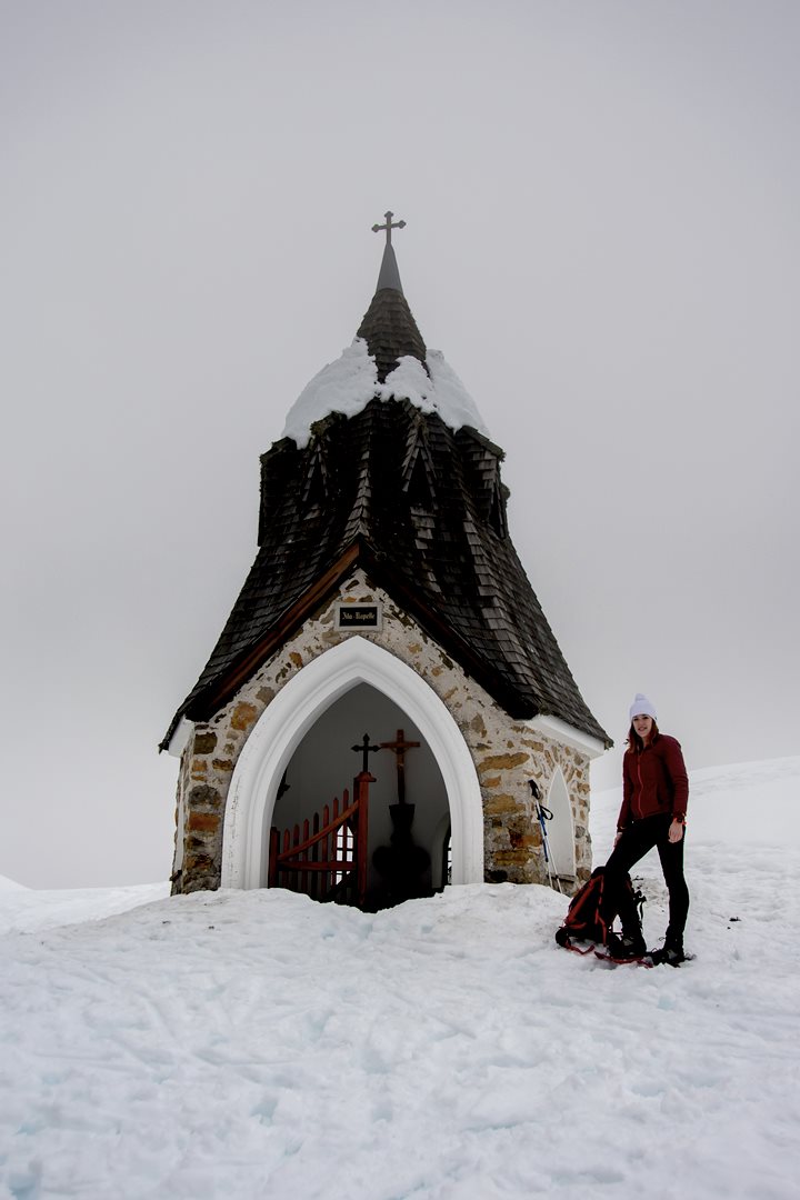 Purtroppo, a pochi metri di dislivello dalla meta, la nebbia inghiotte il paesaggio. Il cielo è tutt'uno con la neve e malapena scorgiamo Malga Rauna, sepolta dal manto bianco. Ancora pochi metri e Cappella Zita ci appare in tutta la sua delicata bellezza.