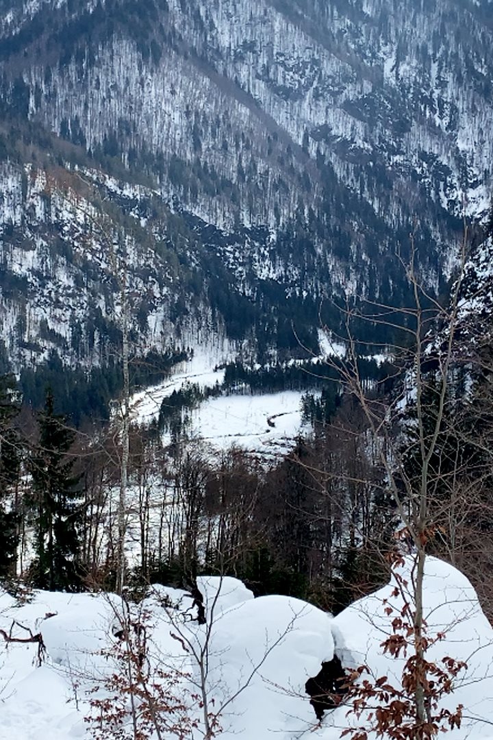 Ci immergiamo nella foresta e dopo pochi metri indossiamo già le ciaspole. Seguiremo la strada forestale ma in molti punti il sentiero CAI 607 consente di abbreviarla tagliando nel folto del bosco. Dato lo spesso manto di neve, non rischiamo e ci godiamo la vista sulla val Saisera che si fa minuscola sotto di noi.