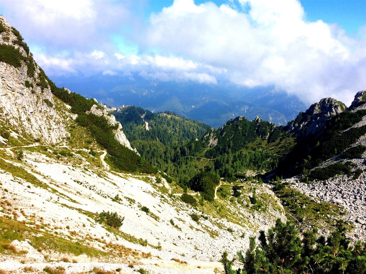 Oltrepassato l’incantevole borgo, percorriamo il sentiero del Cammino Celeste e dell’Alpe Adria Trail che in questo tratto coincidono, e, ci incamminiamo verso Cima del Cacciatore, posizionata tra due Valli importanti: Val Saisera e la Val di Riofreddo.