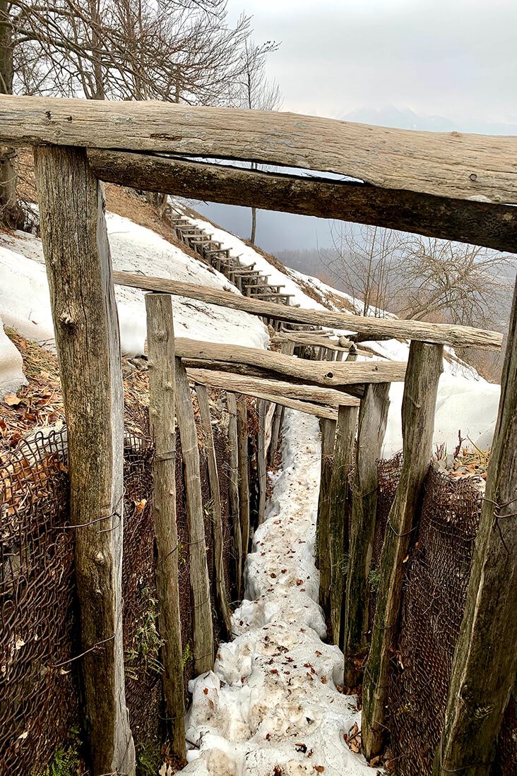 Per raggiungere il monte Kolovrat si passa per ponte San Quirino, in direzione Grimacco-Drenchia e via su fino al passo Solarie. Io ho scelto un sabato mattina per arrivarci. Una giornata piuttosto umida, la neve ancora presente e poca gente intorno. Ho percorso qualche chilometro di trincee, in salita e in discesa, ma a un certo punto mi sono fermata. Questo territorio porta a riflettere, ed è quello che ho voluto fare con questo racconto: i confini non esistono.