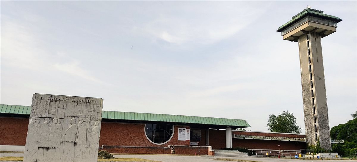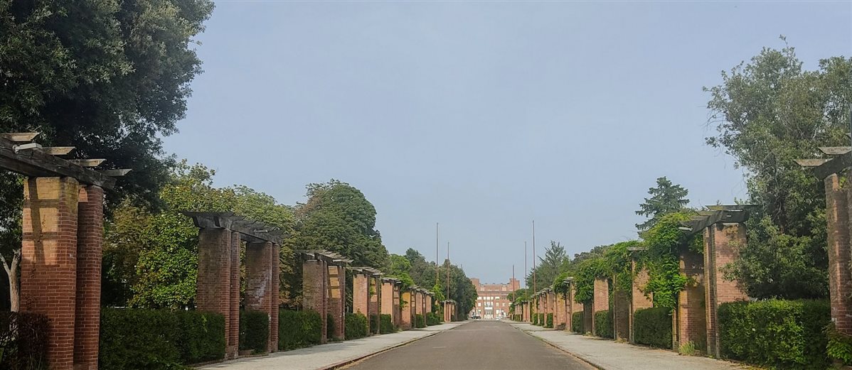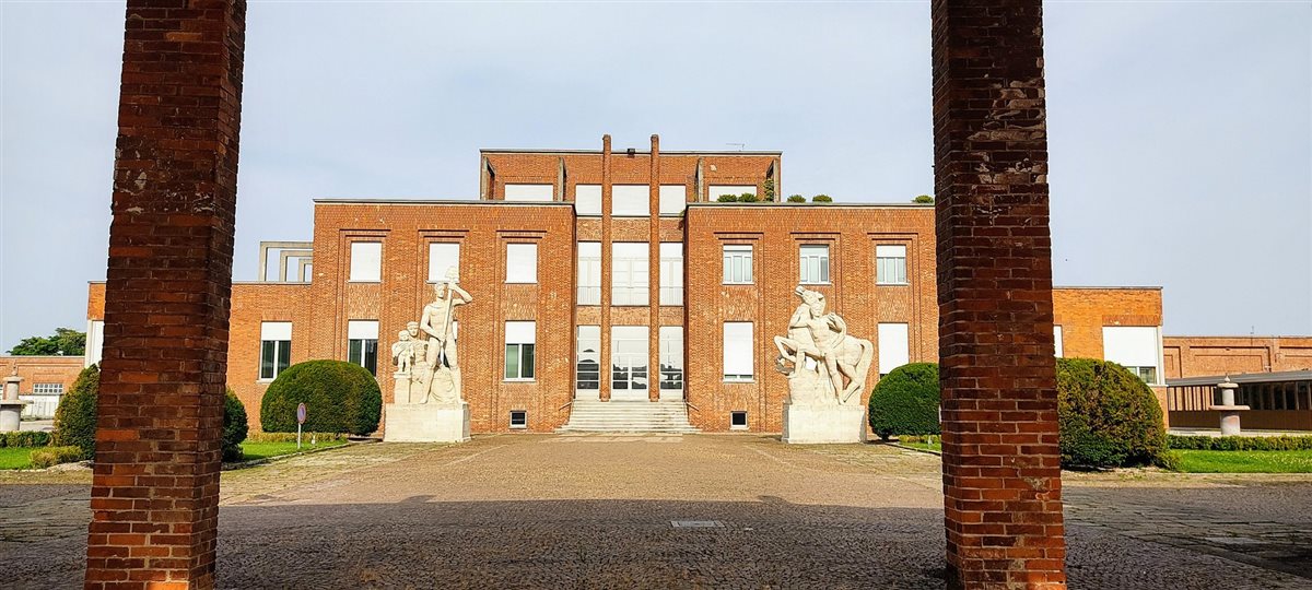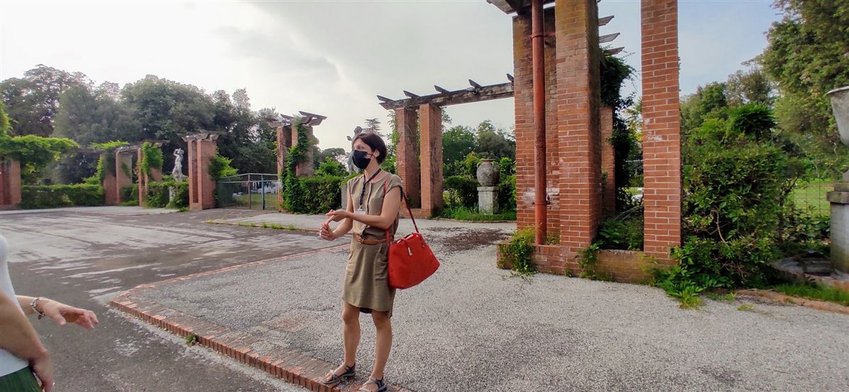Così, ho posteggiato la mia auto di fronte alla fabbrica, che fino agli anni ‘60 era la SNIA Viscosa, per seguire Serena, la nostra guida, che ci avrebbe portato in tour passeggiando tra un’architettura unica e inconfondibile. Davanti a luoghi da me ammirati una miriade di volte, ho scoperto qualcosa di sensazionale: Torviscosa, una delle “città di fondazione” sorte in Italia con i caratteri dell'architettura di regime, è l'unica città nel suo genere a considerare il connubio tra industria e agricoltura.  Lo si capisce dalle due imponenti statue presenti all'ingresso della fabbrica e lo si dedurrà in seguito visitando i complessi residenziali delle Case Gialle e delle Colombaie, un tempo riservati agli operai, e visitando le agenzie agricole. Continuando a passeggiare da piazzale Marinotti scorgiamo il complesso del ristoro e del teatro costruiti con i tipici mattoni rossi, strutture create ad hoc per fornire a impiegati e dirigenti l'aspetto ludico del post lavoro ispirandosi al concetto di “città ideale”. Proseguendo attraverso il maestoso viale Villa, decorato un tempo da numerose fontane funzionanti, si passa davanti alla residenza dell’allora presidente della SNIA Franco Marinotti e si arriva al parco delle piscine. Concludiamo questa parte in piazza del Popolo, che, come le altre piazze delle città di fondazione, è ispirata alla pittura metafisica di De Chirico. La visita si è conclusa a Malisana, paese dalle origini molto antiche che in epoca romana si trovava sul tracciato della via Annia, con la visita ad una delle agenzie agricole in cui la SNIA aveva suddiviso il territorio. Qui abbiamo visitato anche la chiesetta dell’Immacolata Concezione, normalmente chiusa al pubblico, per ammirarne gli affreschi medievali.