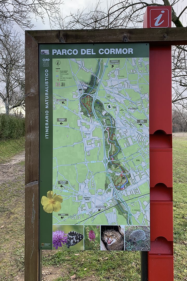Vi pubblico la foto della mappa del parco: potete percorrere due circuiti ad anello oppure “allungare” verso il parco del Cormor.
