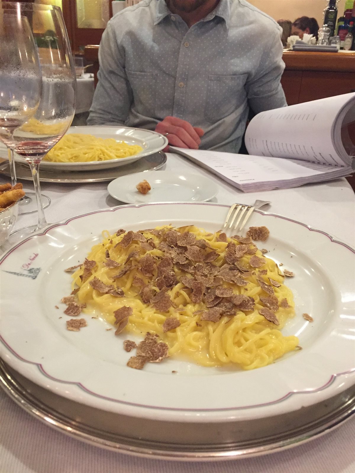 Ora è il momento dei tagliolini al tartufo bianco, definirli un piatto di pasta è realmente riduttivo, mettiamo poi “i puntini sulle i” da Nando non esiste il “far economia”, qua il tartufo è come la neve nel periodo più bello dell’anno. I tagliolini color dell’oro splendono di carati propri, il fondo fatto con il burro crea un cuscino dove essi si adagiano ed infine, ma non meno importante, una cascata di petali di tartufo bianco e piccoli cristalli argentei di Parmigiano Reggiano che avvolgono maestosamente il piatto.