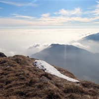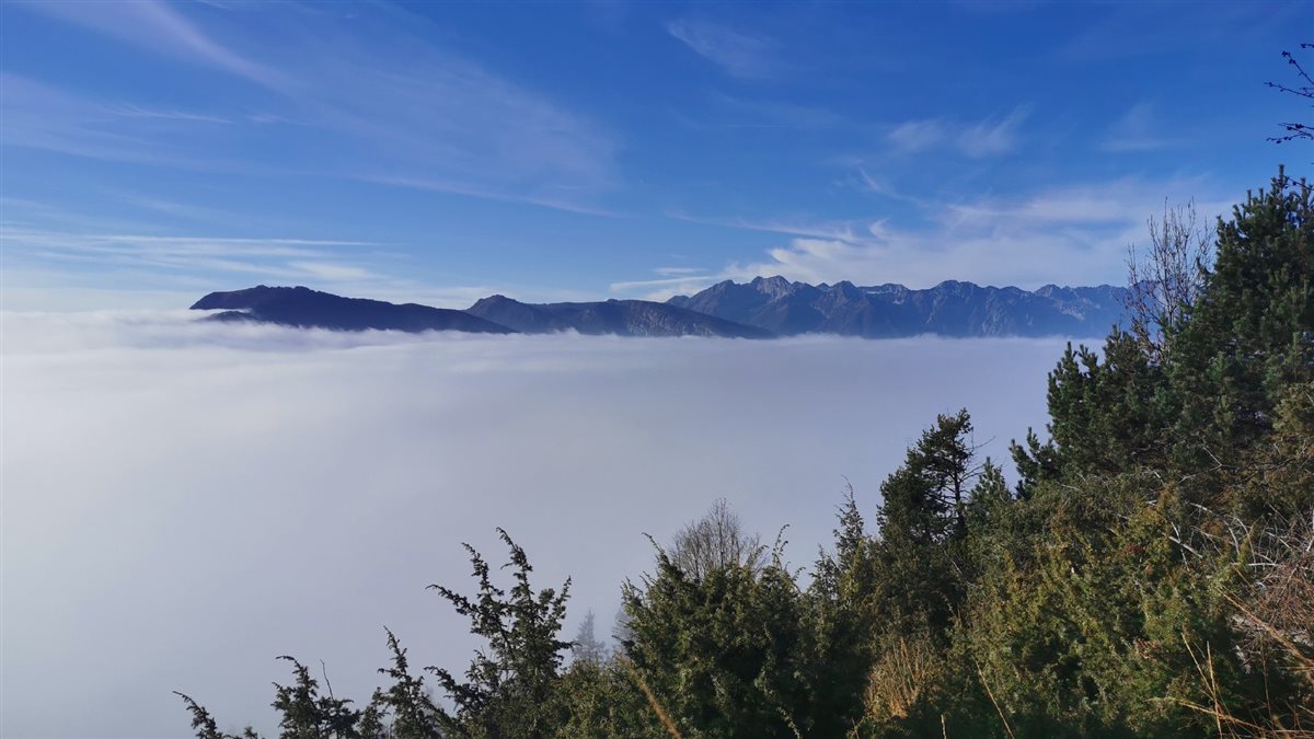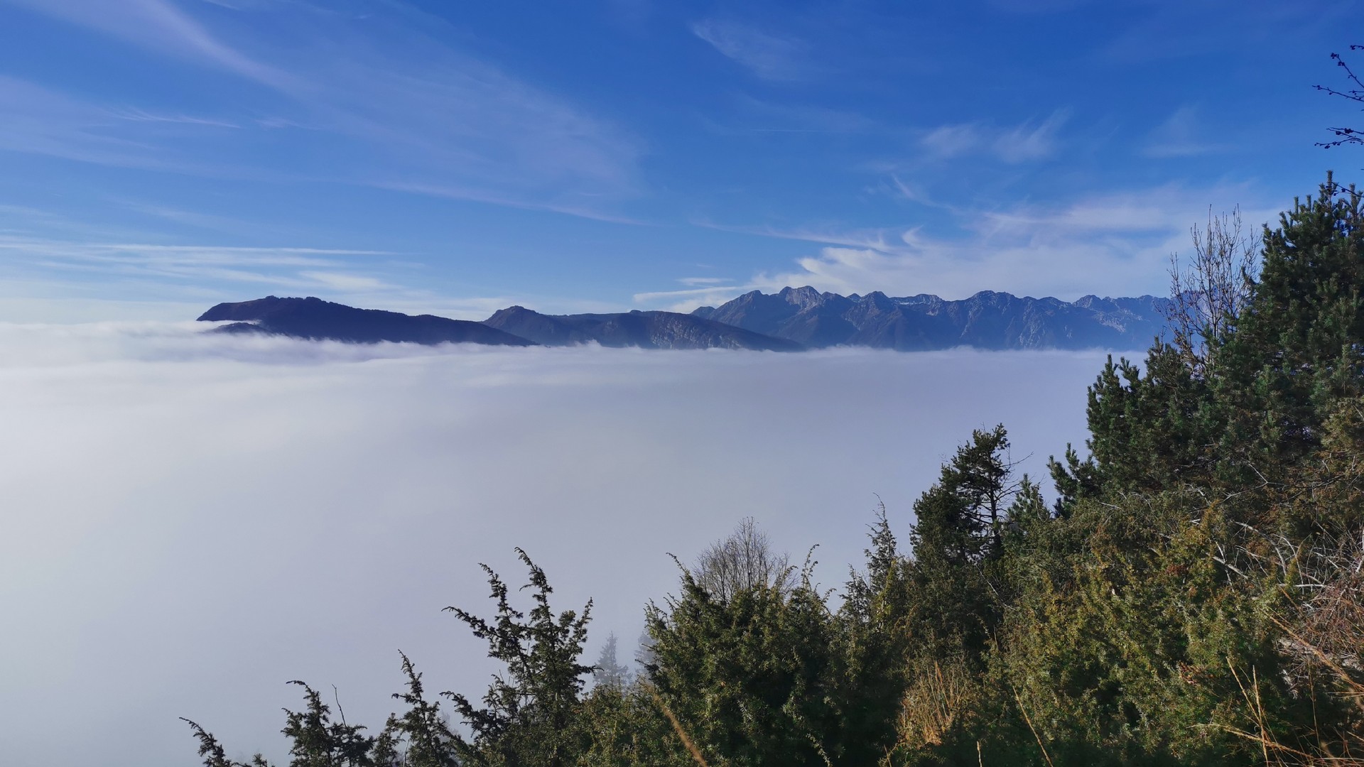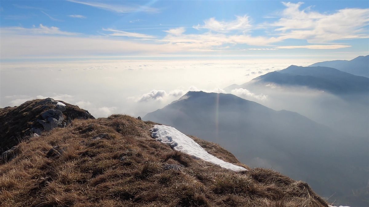 Poi improvvisamente, con la testa concentrata solo a mettere i piedi uno davanti all’altro, ho raggiunto Forcella Capra, da dove inizia il sentiero delle creste, e una cornice di montagne si è materializzato davanti a me, come una cartolina appena stampata viva di colori, mentre un manto di nuvole si stendeva poco sotto, come un tappeto di cotone soffice solo a guardarlo.