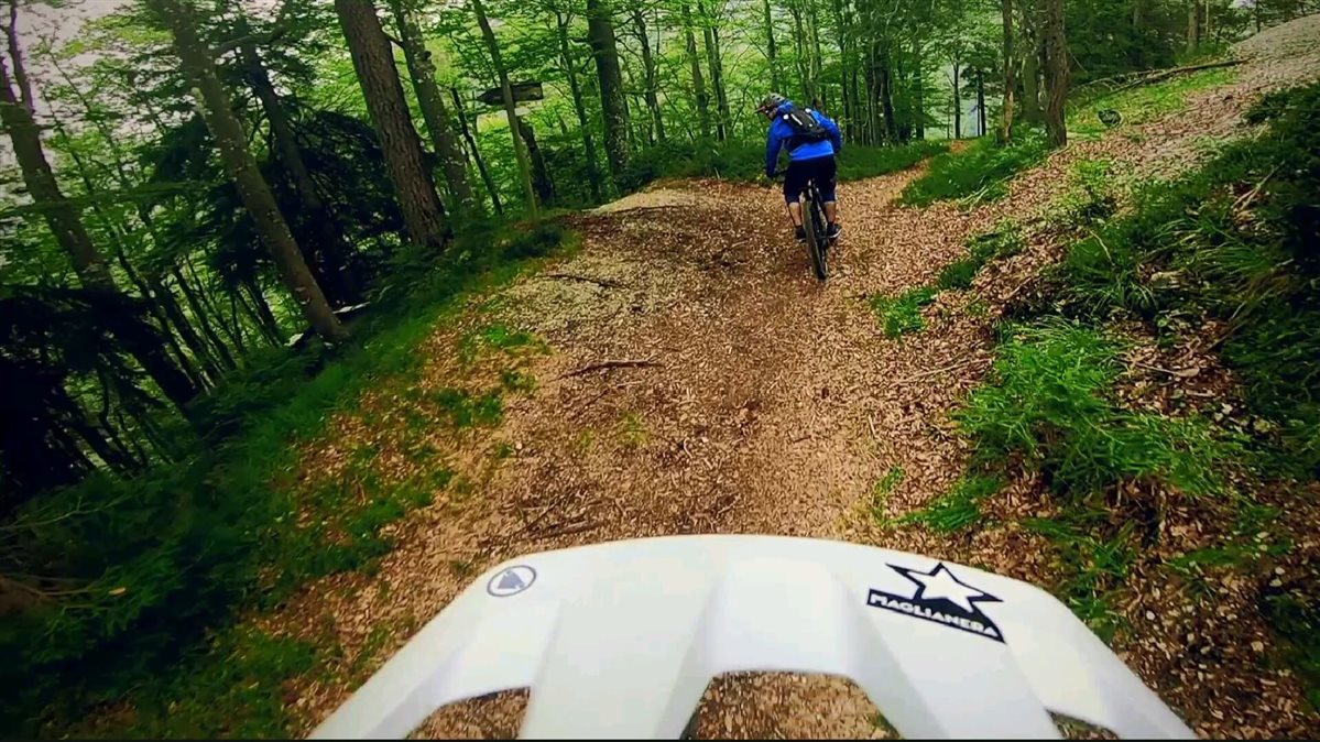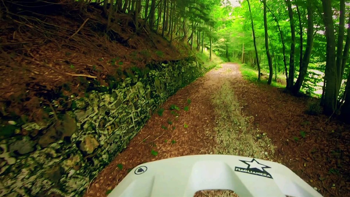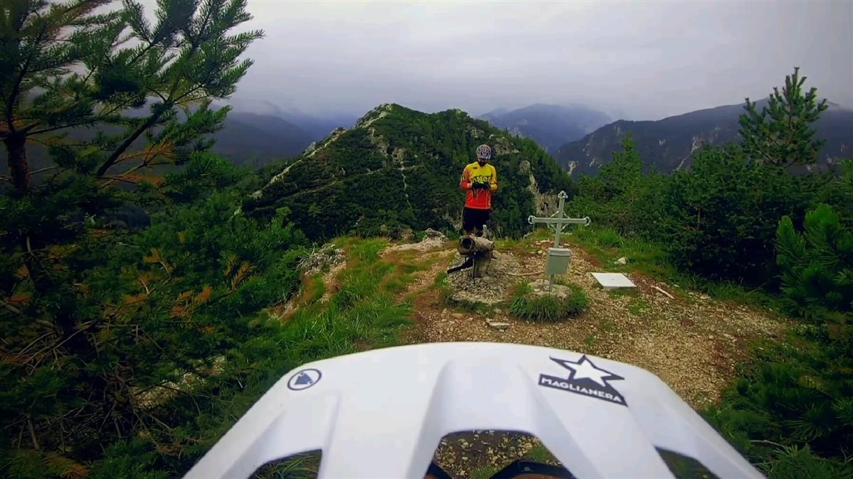 Gli ultimi metri non si presentano più ciclabili e siamo costretti a caricare le bici in spalla (sport completo la mtb!!!) fino alla cima. Qui dopo le foto di rito e la firma del libro di vetta siamo pronti a immergerci nel ritmo e nella fluidità del single track che ci riporta a fondo valle, facendo scorrere le nostre mtb su un letto di scrocchianti foglie secche, fra sponde naturali e tornanti stretti.