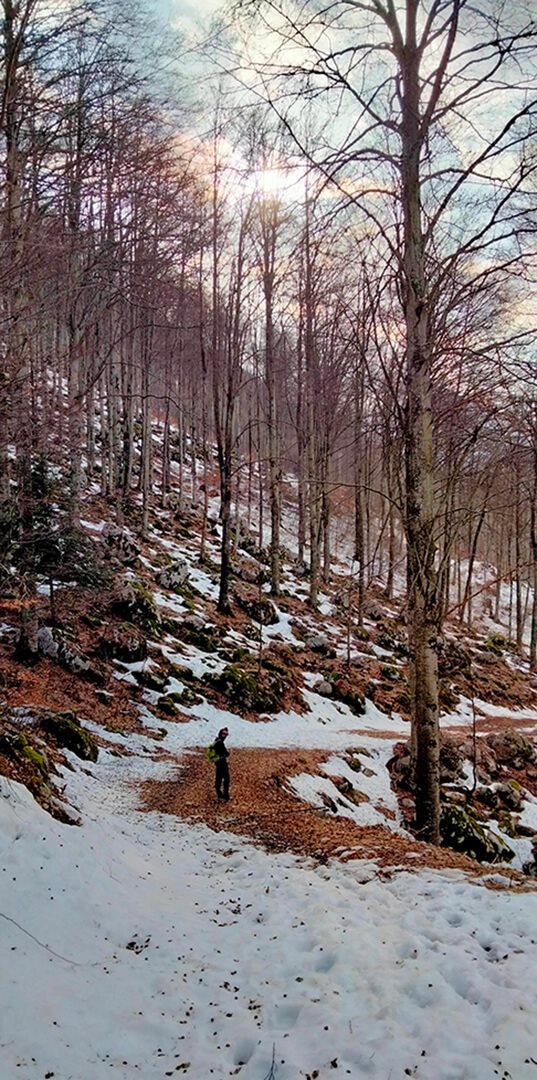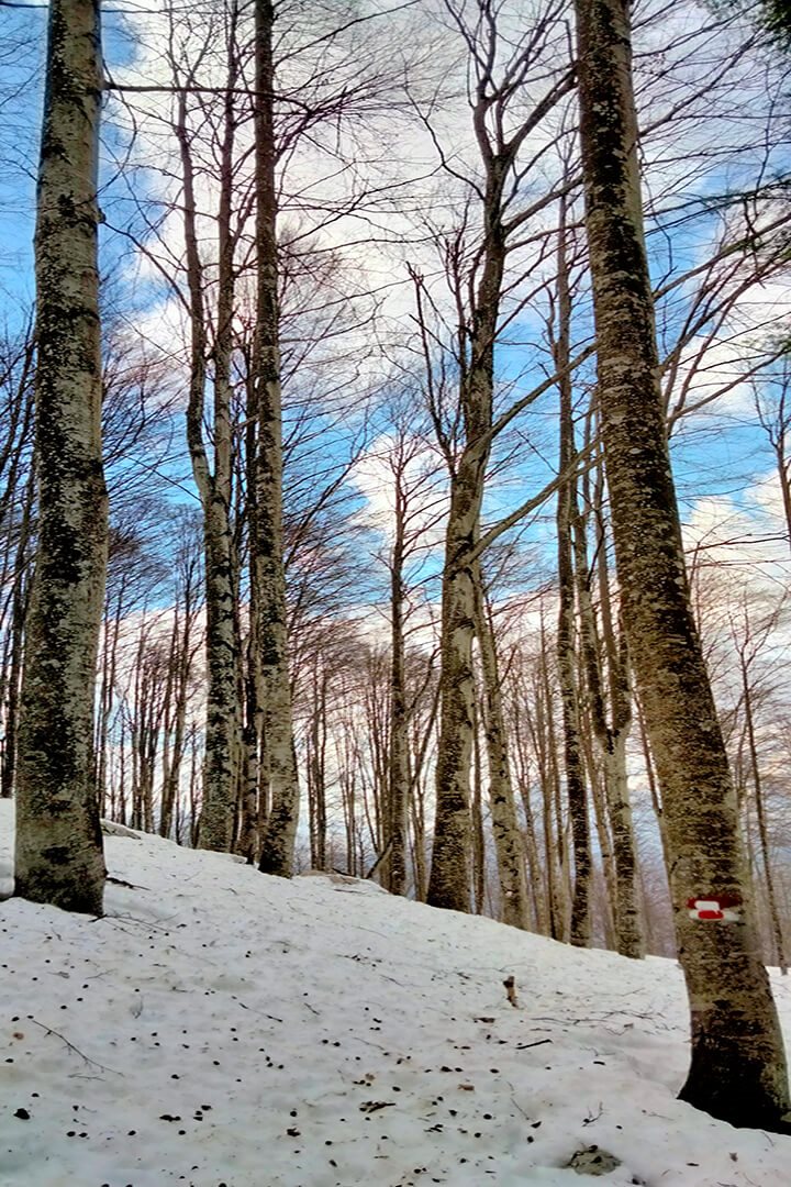Proseguo lungo la strada sterrata compiendo ancora un paio di svolte fino ad incontrare il segnavia Cai n.970 che si stacca sulla sinistra verso un bosco di faggi.