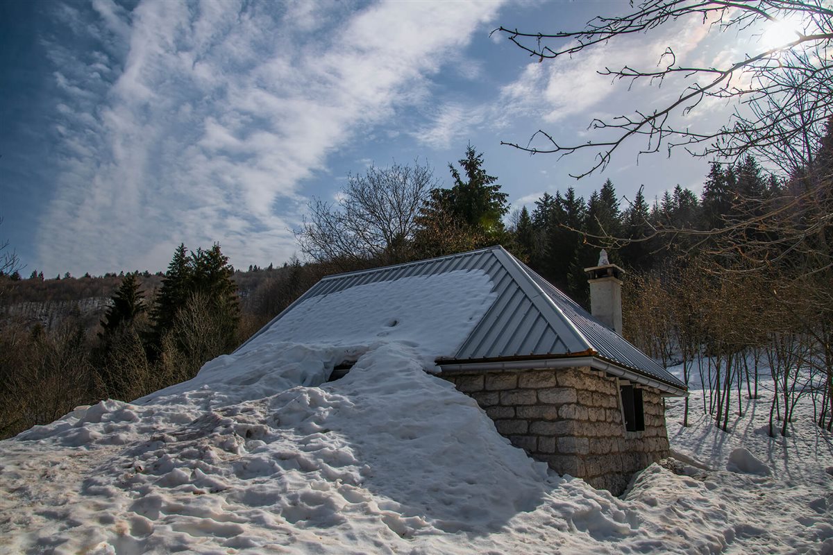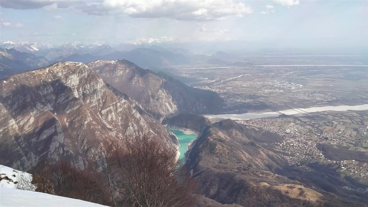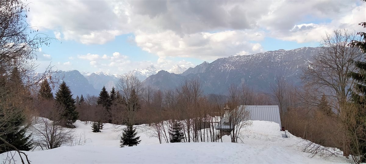 Dopo circa due ore di salita tra boschetti e conche raggiungo la Casera la Pala a 1203m.: un bivacco accogliente dotato di camino, tavoli e posti letto. Scatto qualche foto e proseguo poi nel silenzio del bosco innevato fino a raggiungere il bivio per la Pala d'Altei. Mi ritrovo ora in un’ampia conca erbosa ricoperta di neve con vista sui monti del Piancavallo, proseguo per la vetta, manca poco ormai!