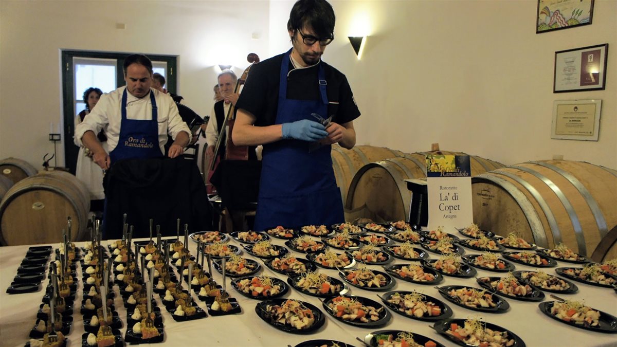 Il portone della cantina si apre e subito veniamo avvolti dai profumi delle varie preparazioni disposte nel lungo percorso culinario che si snoda all’interno della cantina.