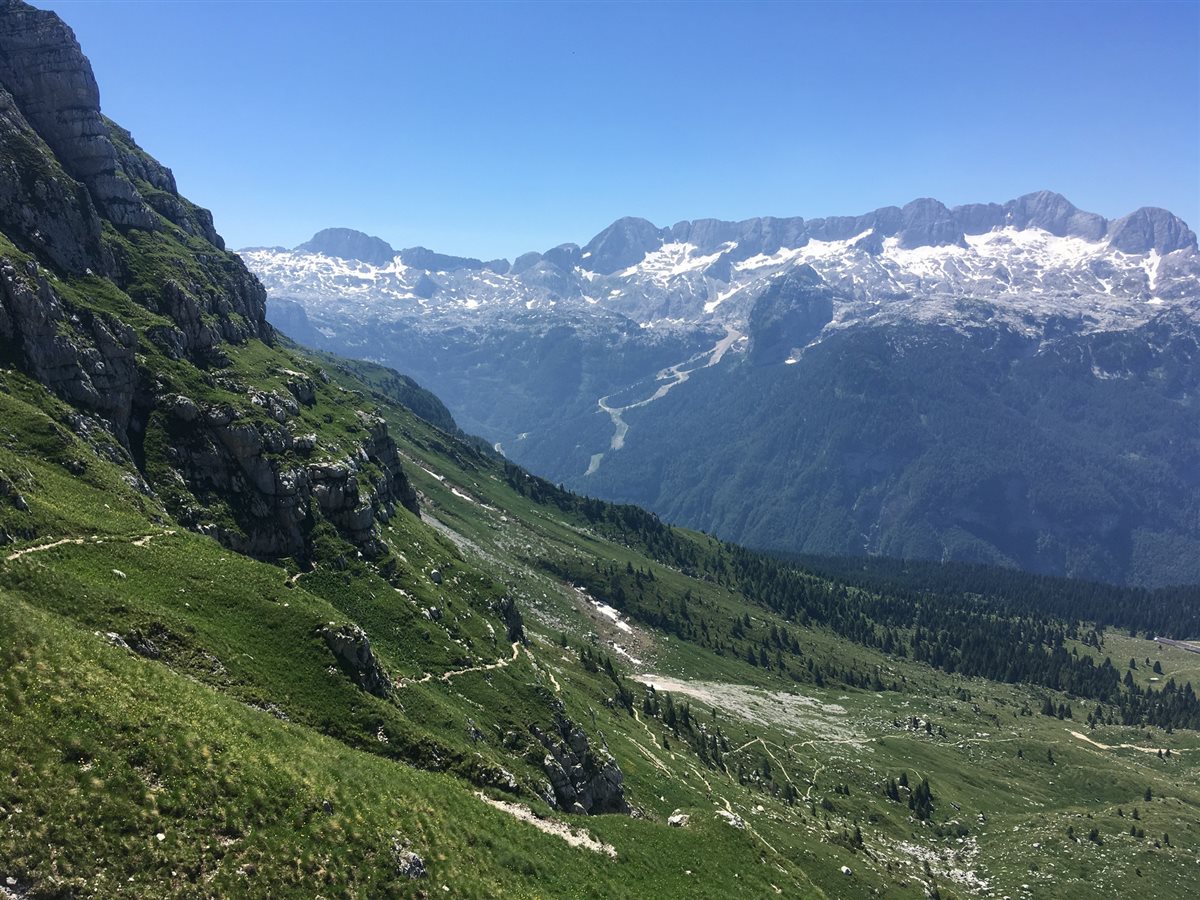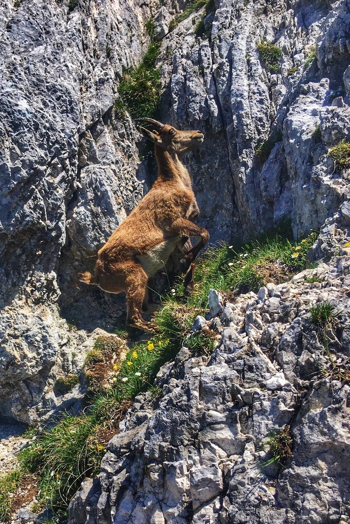 Si parte. La vista è fin da subito incantevole. Tutto attorno un tripudio di colori, sembra una tavolozza impressionista. Primule orecchia d’orso e Campanule di Zoys, delicate come pochi fiori, sono solo due esempi dei fiorellini di montagna che troverete lungo il percorso. Il primo tratto è meno ripido e vi sono dei lunghi tornanti che rendono la salita meno faticosa. Il sentiero è semplice ma da non sottovalutare. Vi sono dei punti più esposti e ghiaiosi, inoltre i simpatici e curiosi stambecchi che si incontrano, tendono a balzare indisturbati da una parte all’altra e a volte fanno rotolare i sassi giù per la montagna. Sono un po’ birichini. Fotografateli, ammirateli ma tenete sempre gli occhi aperti. Arrivata a metà del percorso, l’aria si fa più frizzante e respiro finalmente il profumo della conquista: sono a 4 km di distanza dalla vetta. Dopo una breve pausa, riprendo con la mia escursione, il panorama è mozzafiato, attenzione per chi soffre di vertigini, in quanto alcuni tratti possono destabilizzare.